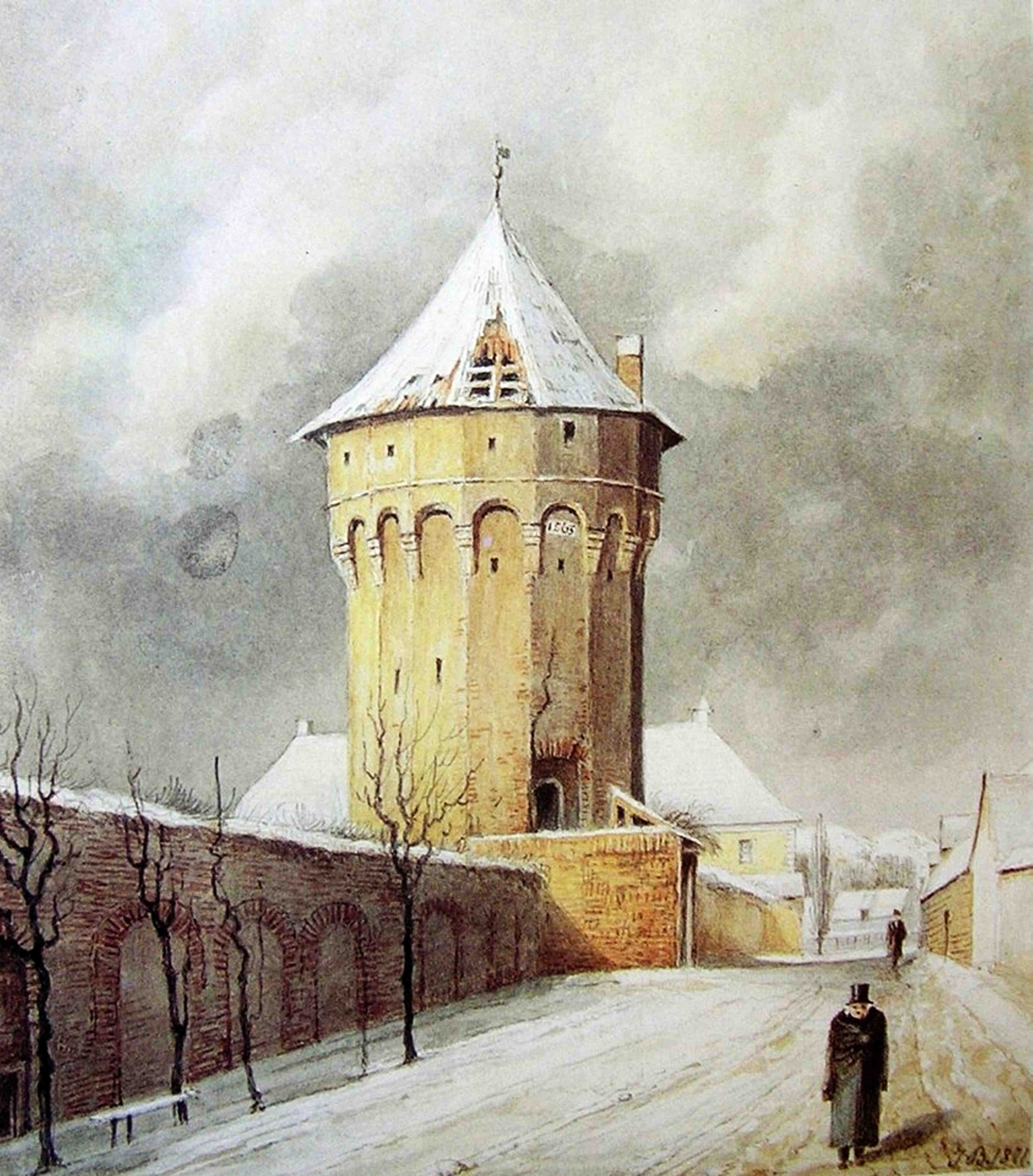 Stânga: Turnul Pulberăriei // Pulverturm lângă Poarta Ocnei. Detaliu din pictura, „Poarta Burger – vedere din exterior”, realizată de Johann Böbel în 1857.