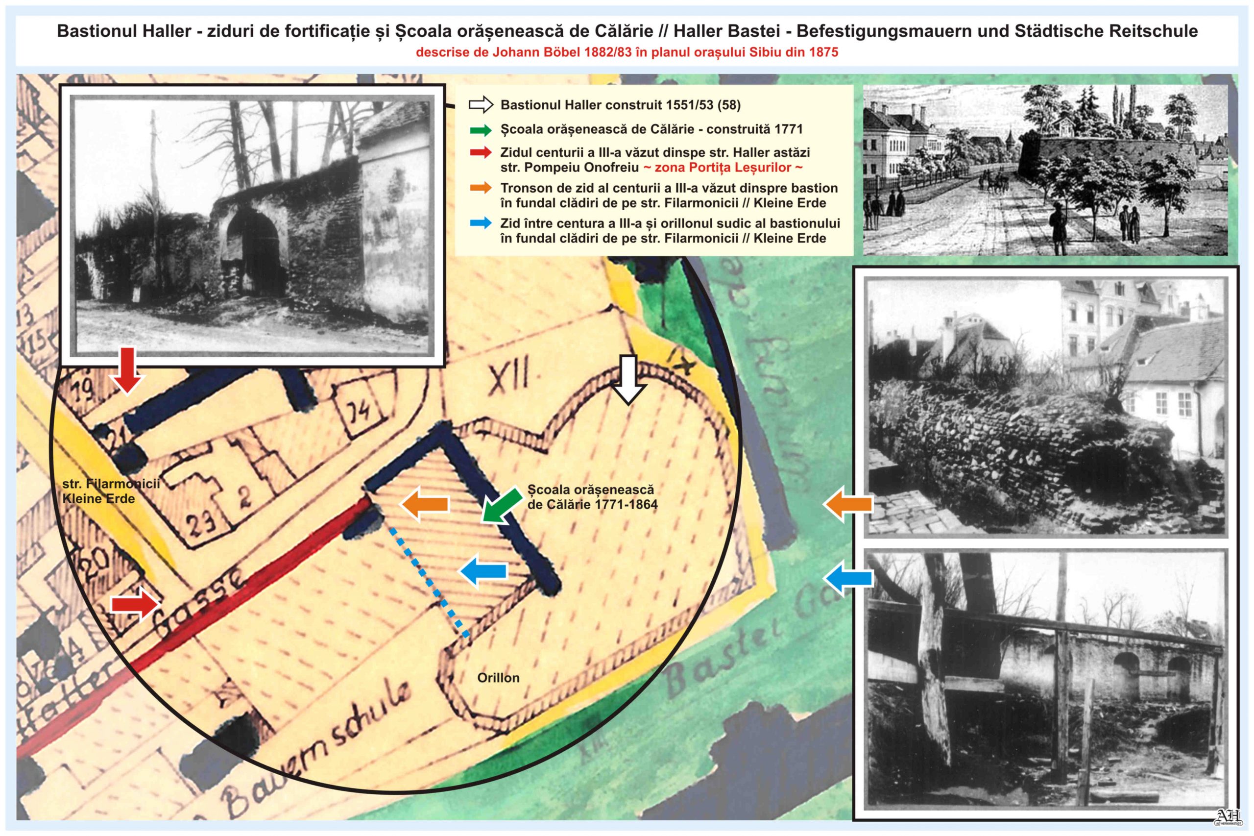 Textul original în limba germană din planul lui Böbel: „Die Veränderungen welche entstanden sind, seid dem Jahre 1830 bis 1883, in der Stadt und ausserhalb derselben. Abtragung der Stadt-Thore, der Stadtmauer-Thürme, Bastheien und fast sämtlicher Stadtmauern. Abtragung der Lügenbrücke und sonstiger Gebäude, eingegangene Gässchen und Fahrstrassen, neu entstandene Gassen und Strassen, u.s.w. zusammengestellt und in den Plan gezeichnet von Johann Böbel 1882”.