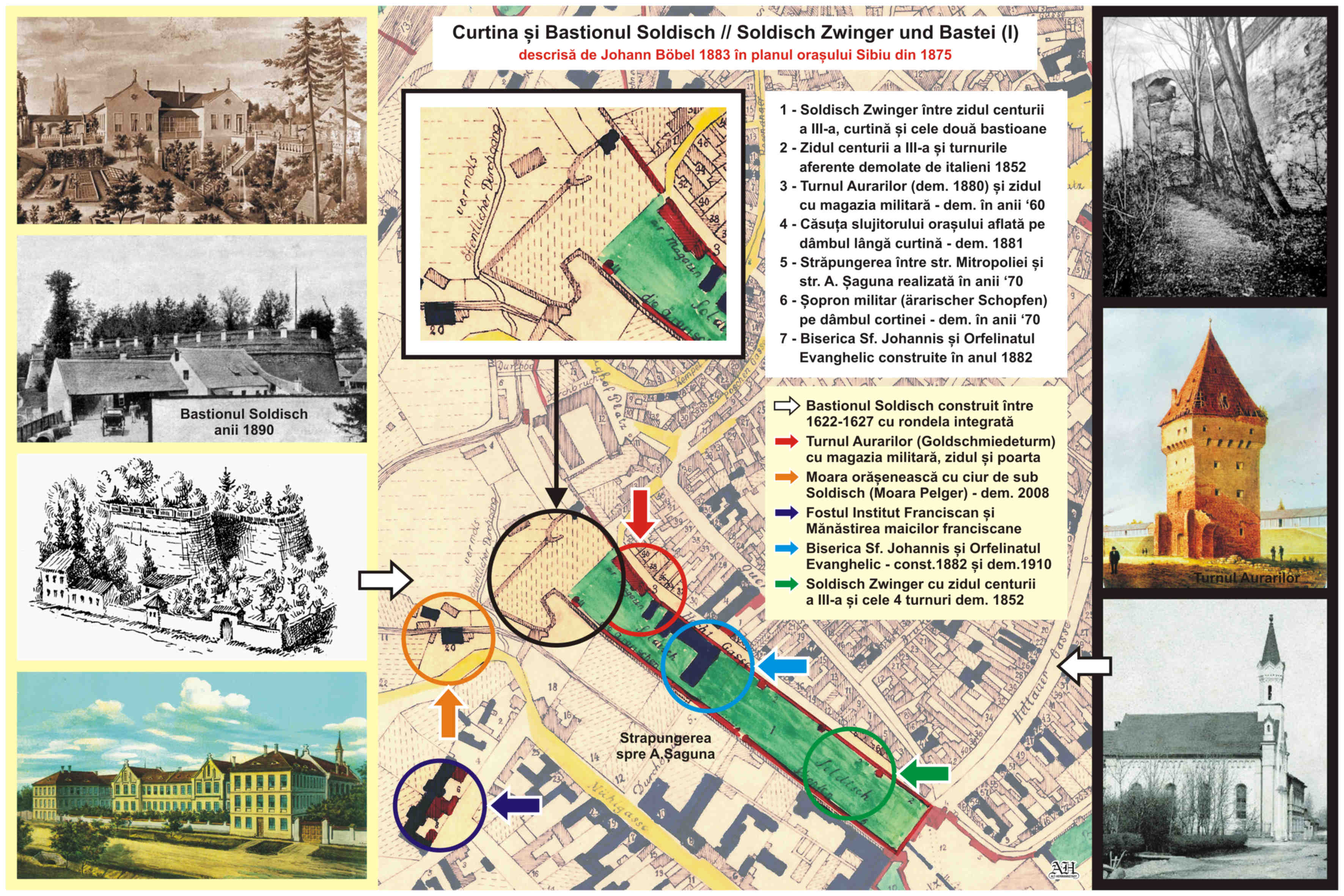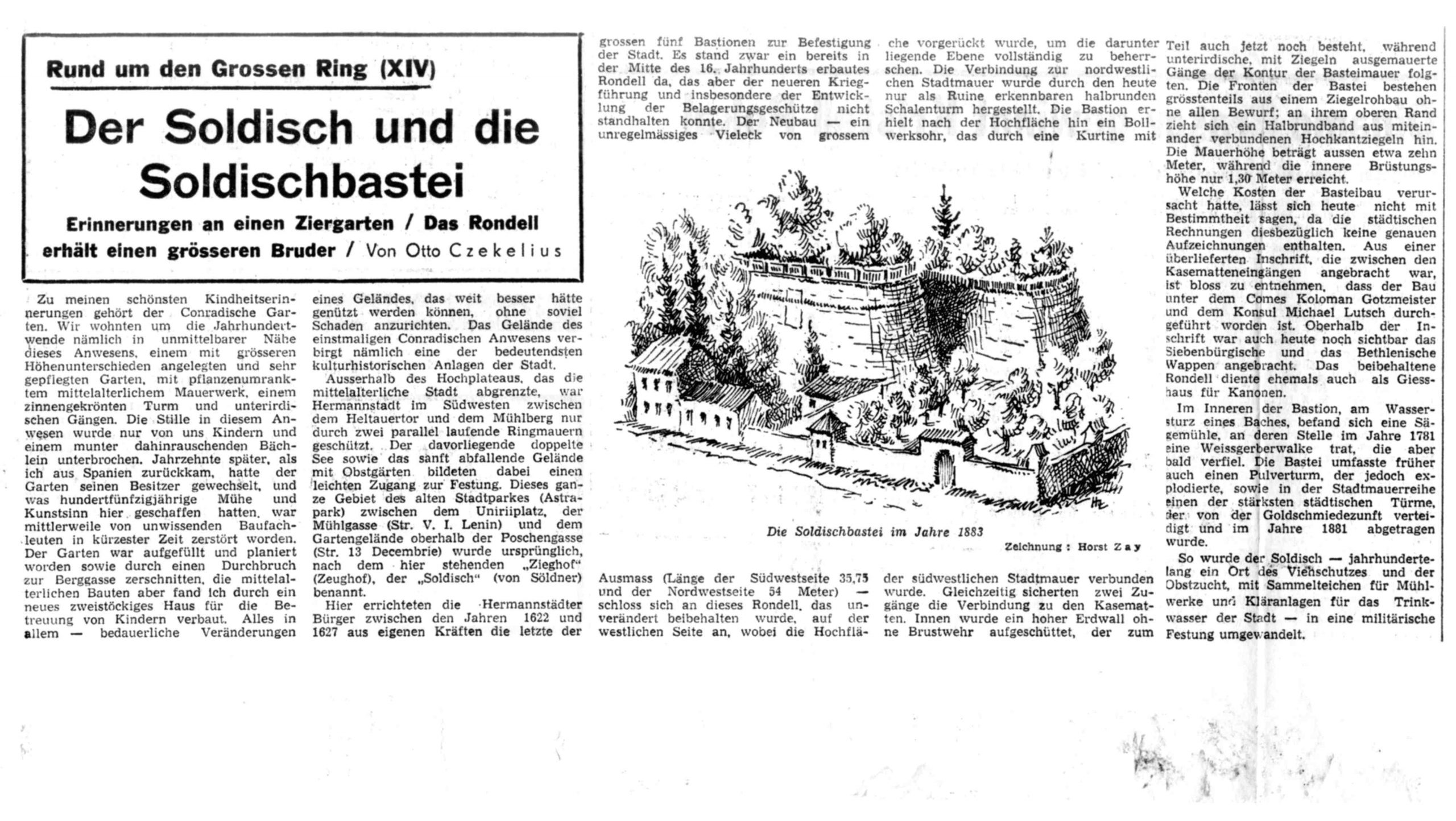 (Curtina și bastionul Soldisch – Text original din harta lui Böbel 1882/83)Bastionul Soldisch ~ Ilustrație: Otto Czekelius „Rund um den Großen Ring“ articol apărut în ziarul Neuer Weg 1976 (Jg. 28 – 8467 vom 4. August 1976, S. 6ff. bis einschl. Jg. 28 – 4898 vom 10. September 1976)