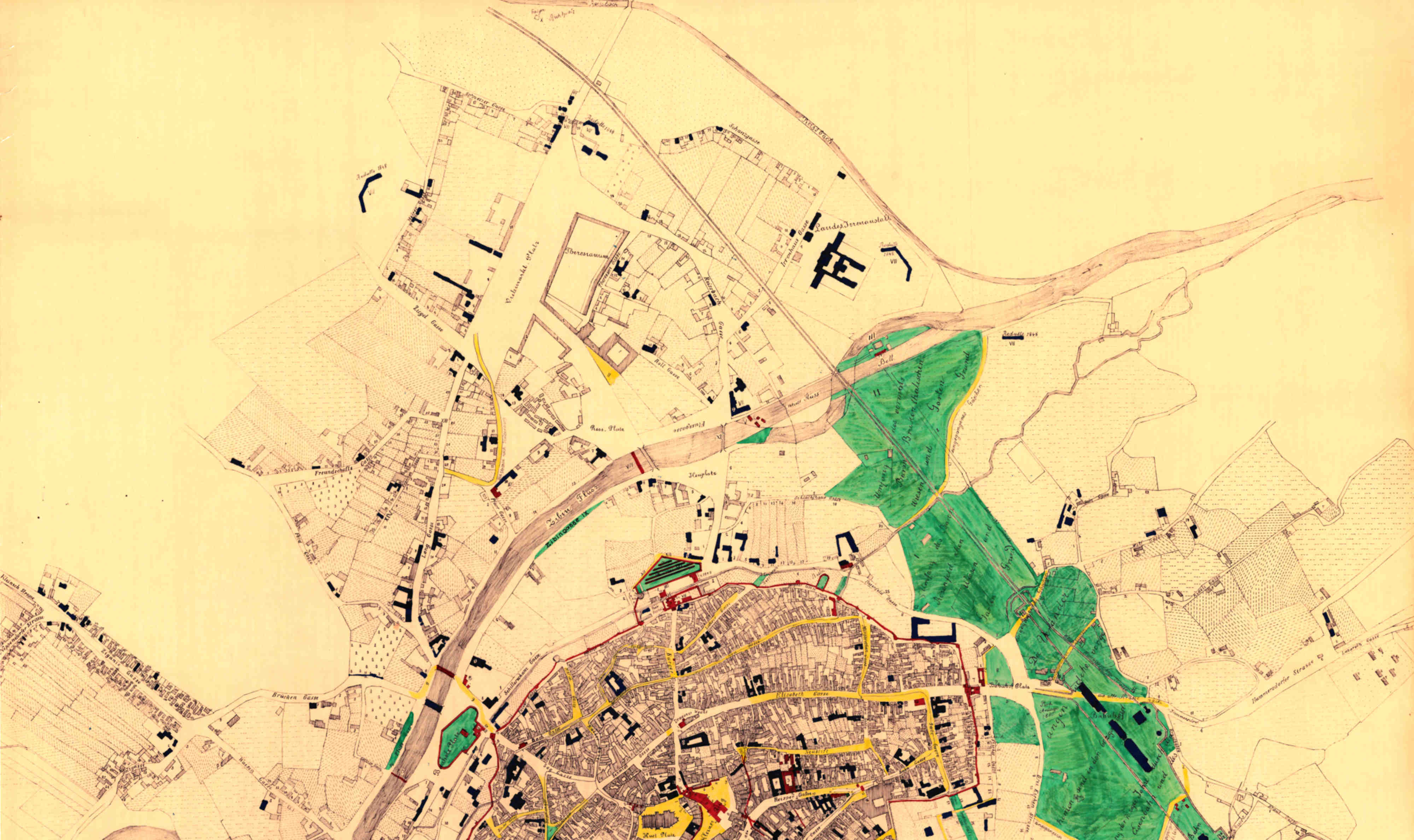 In den 60ziger Jahren Ansiedlung der Barmherzigen, seid der Zeit sind die Umfangreichen grossen Gebäude derselben gebauet worden, (s.Plan)