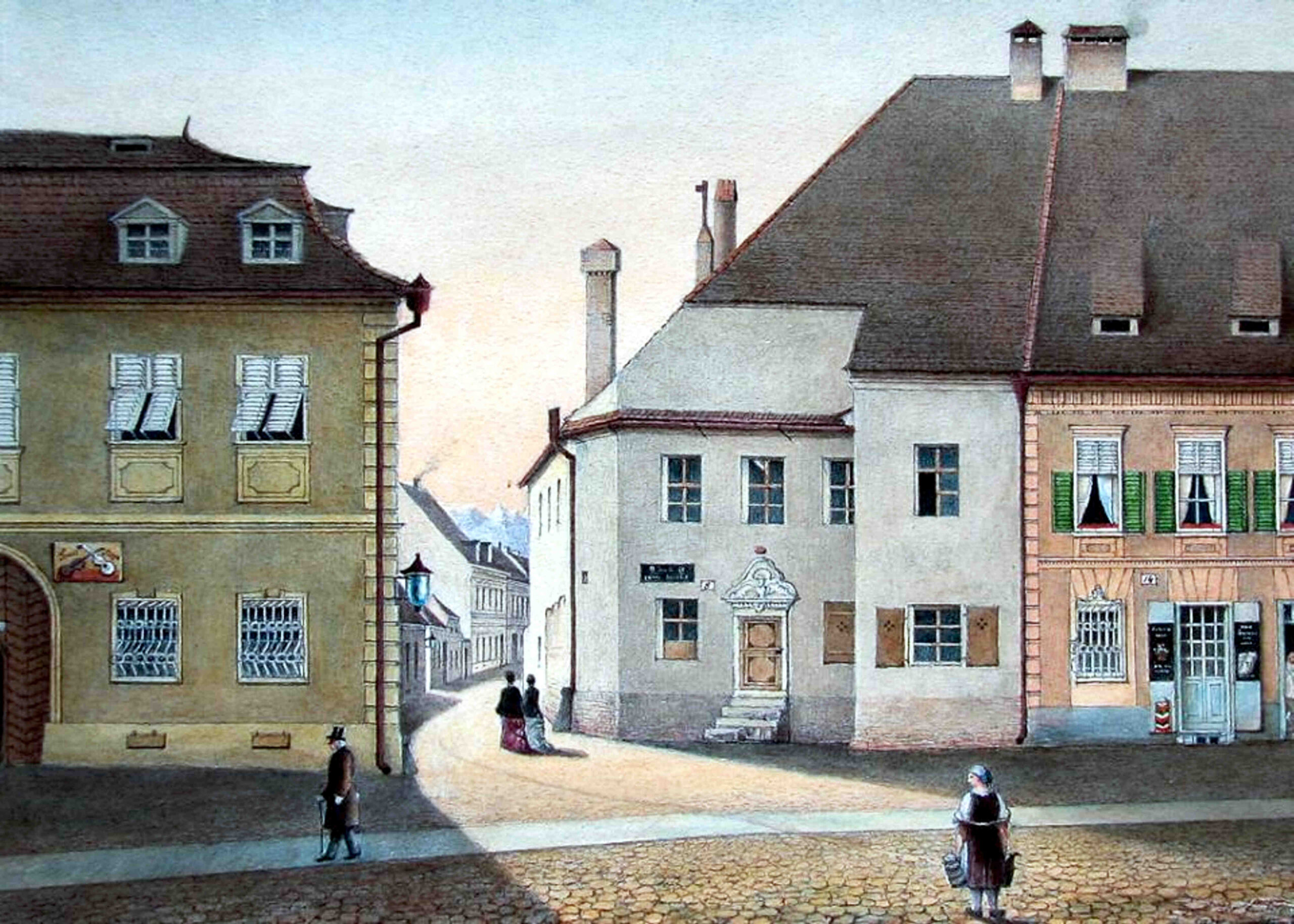 Există altă acuarelă realizată de același Johann Böbel, în care apare Casa Bedeus văzută dinspre actuala stradă General Magheru.