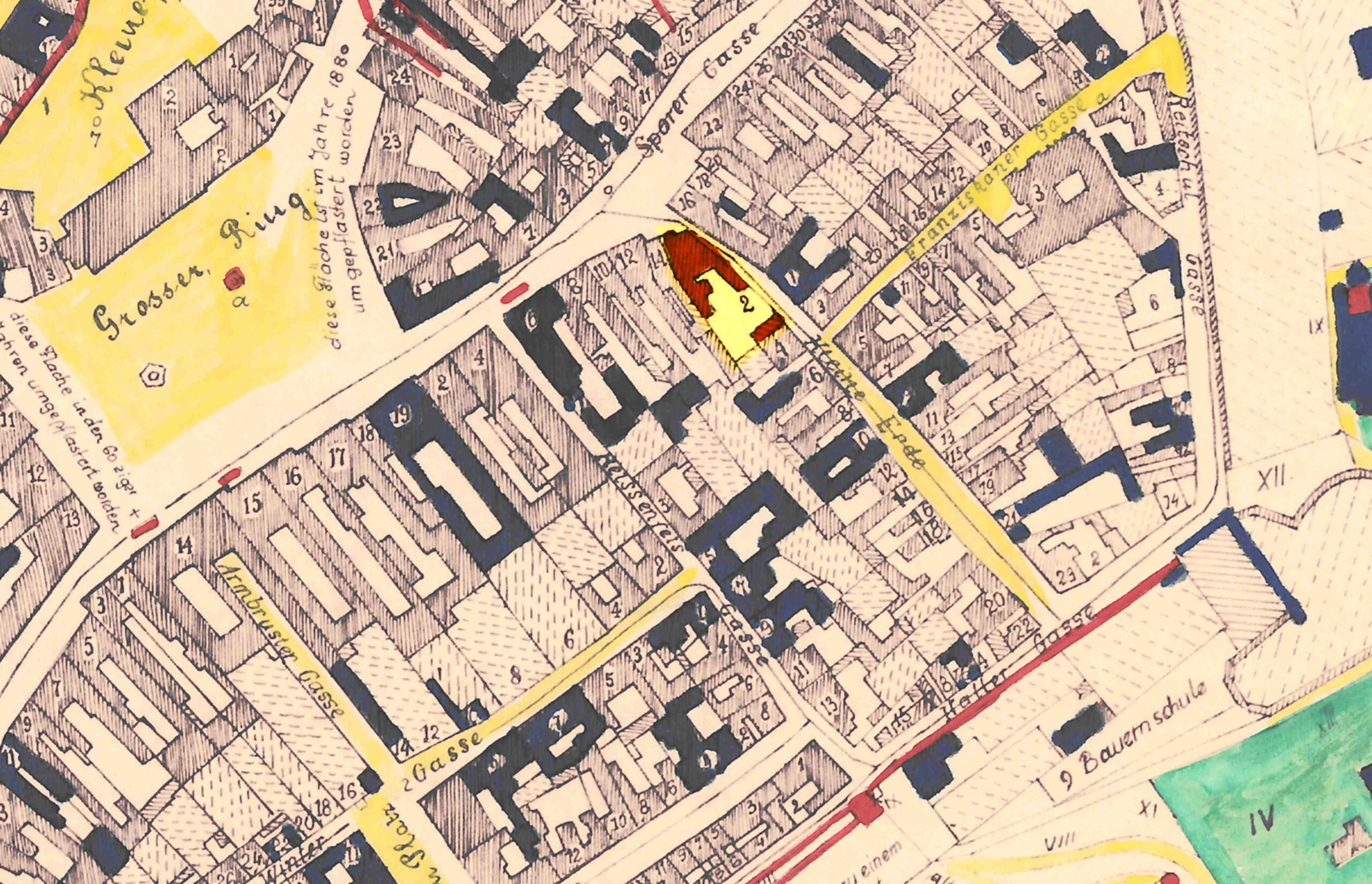 Im Jahre 1880 wurde die Schewis Gasse und der Bach reguliert, und das Haus N.24 abgetragen, (siehe Plan) im Jahre 1882 wurde das Gässchen Verbindung der Kreutz und Schulgasse erweitert zu einer Gasse, in den 60ziger Jahren wurde die Vertiefung vor dem Haus und Garten Nr.30 ausgefüllt. Im Jahre 1856, als das Militair Erziehungs-Gebäude von den Baumeistern Setz senior und Hahn gebaut wurde (jetzt Garnisons Spital) ist zu der Zeit auch die Schewis Gasse erweitert worden am Ausgang zu den Erlen. In den 70ziger Jahren ist der Erker am Haus Nr.12 Berg Gasse abgetragen worden.