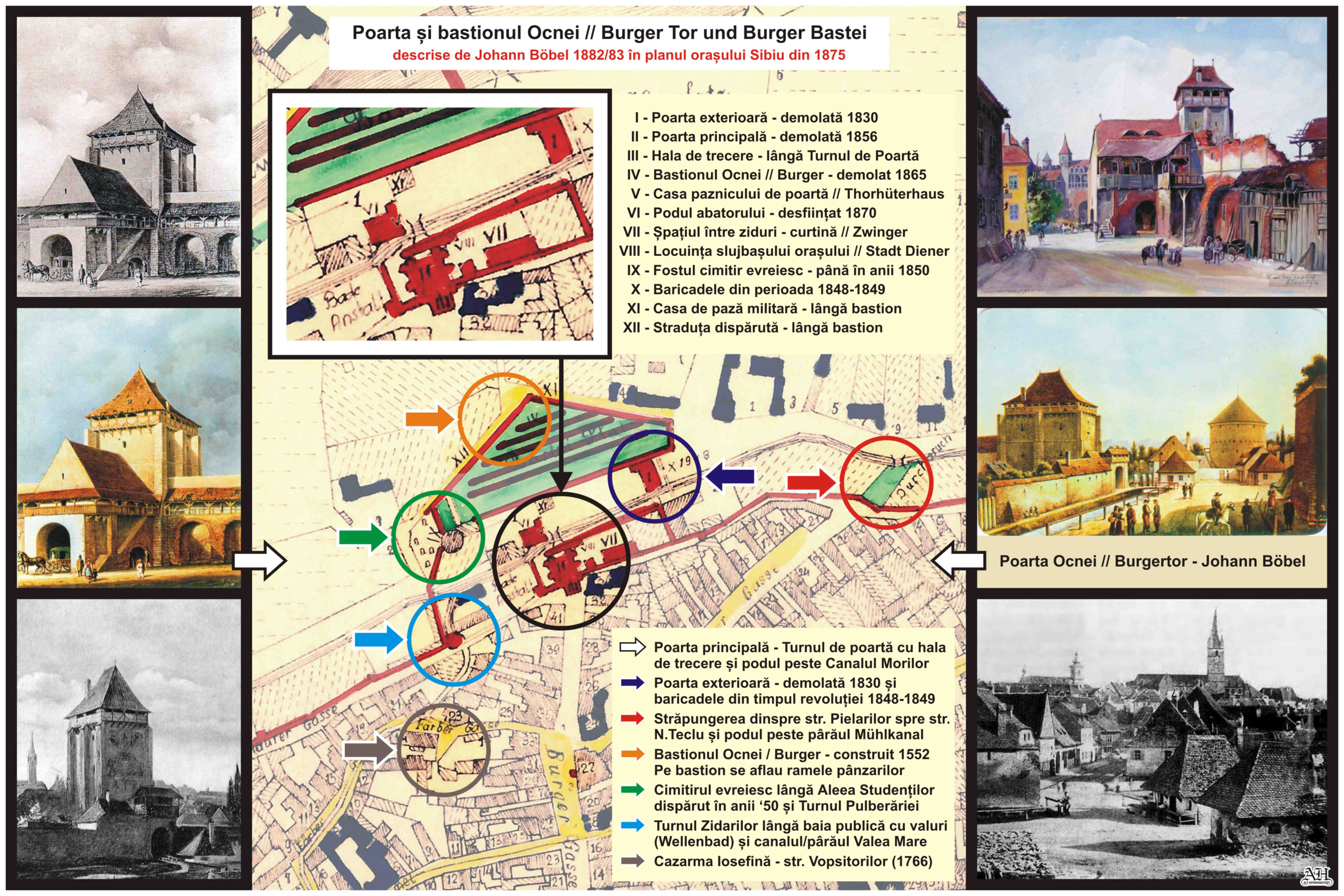 În anul 1882/83 Johann Böbel desenează, notează şi descrie într-o harta din 1875 modificările care au avut loc în oraşul Sibiu în sec.19, între 1830 și 1882. Aici o scurtă descriere a Porţii Ocnei // Burger Tor: