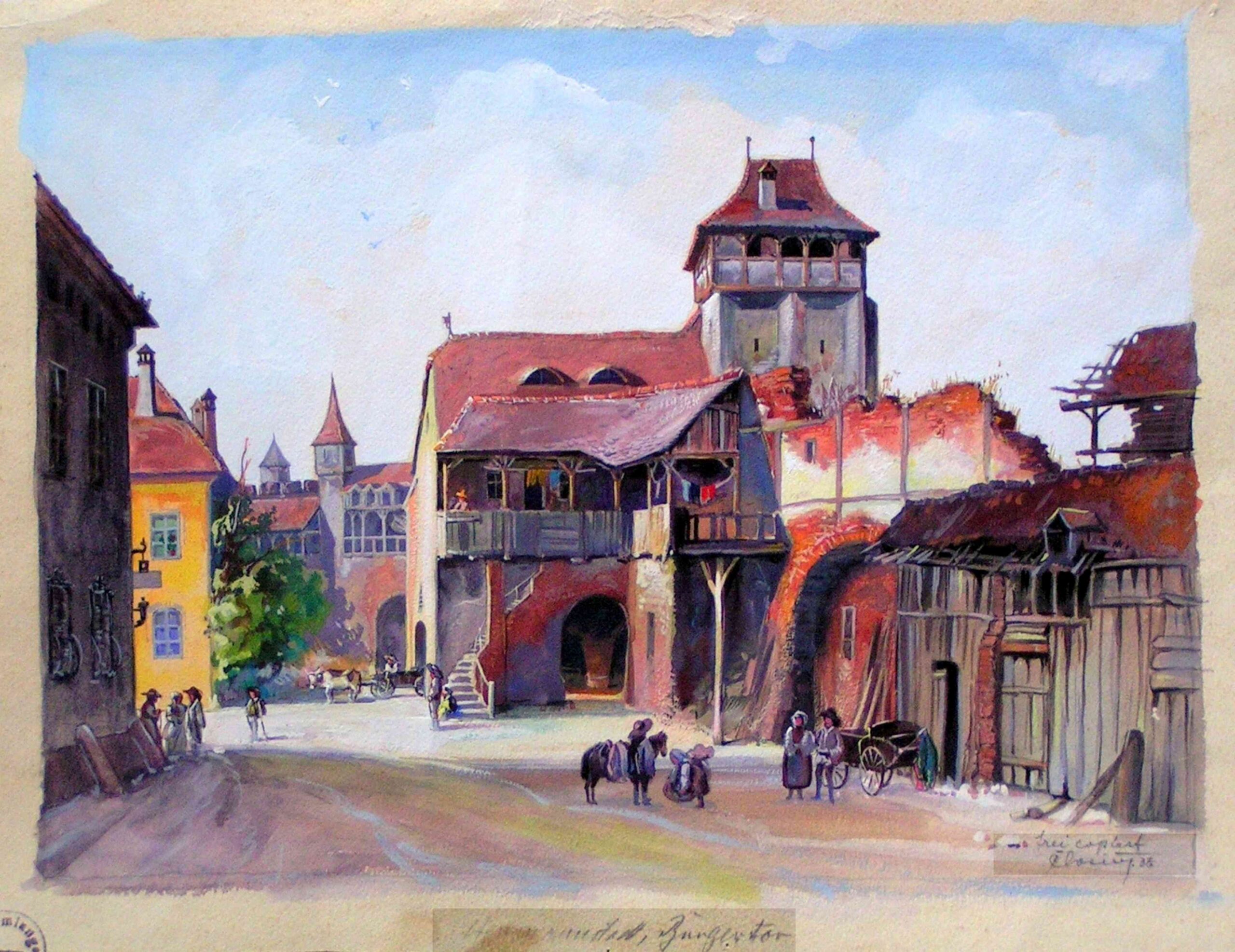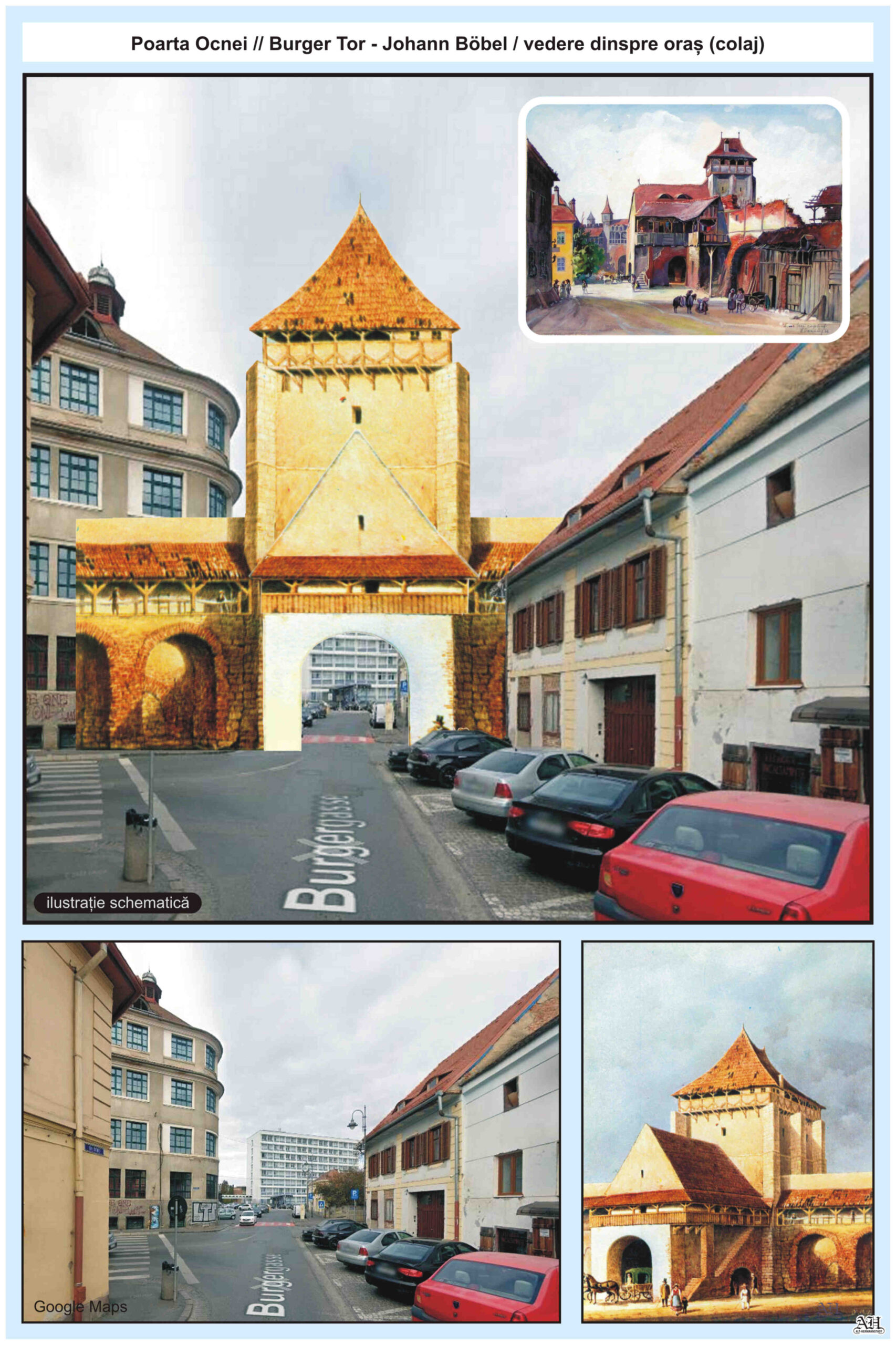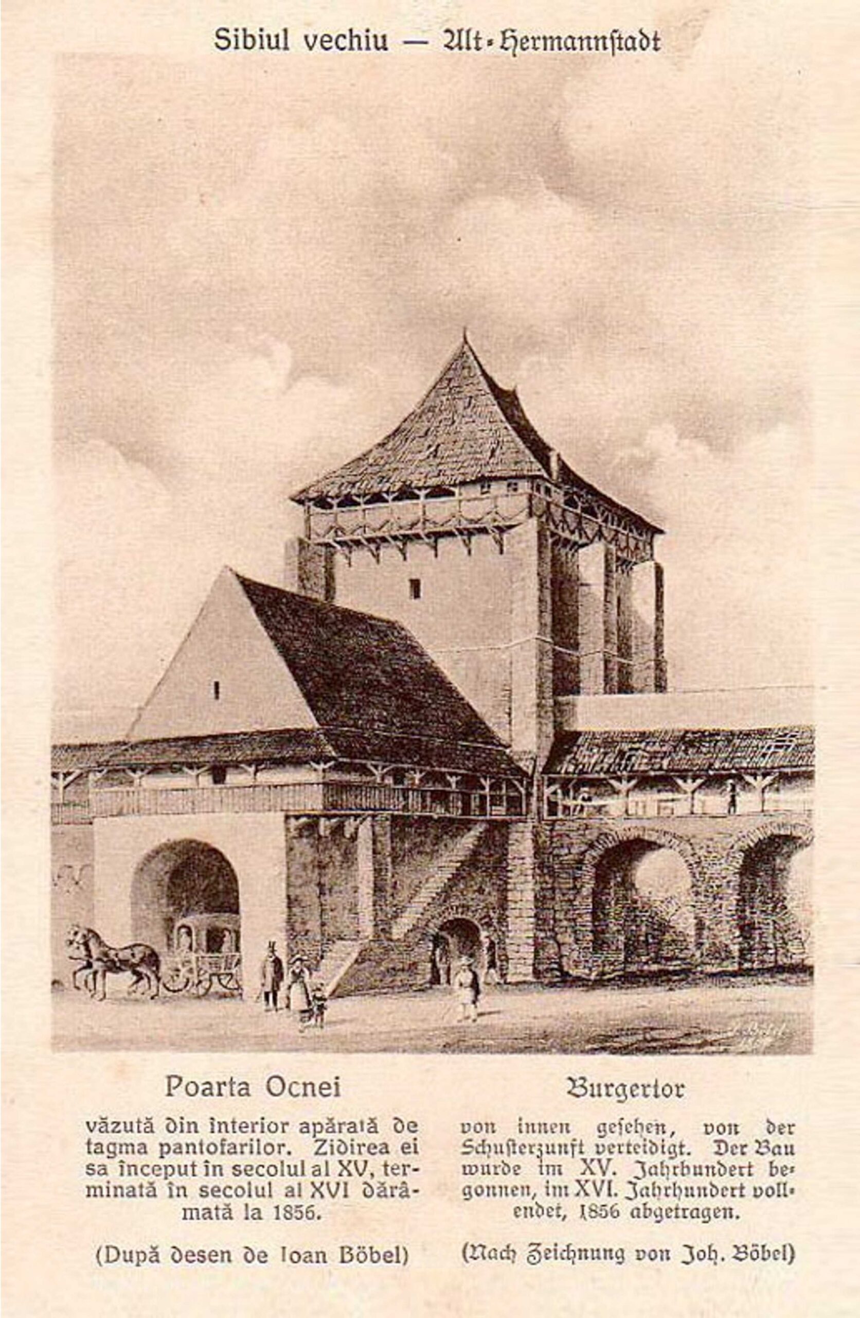 Stânga: „Johann Böbel – Poarta Burger din Sibiu, vedere dinspre oraș (demolată în 1856?)“ // „Das Hermannstädter Burgertor, Innenansicht (abgetragen 1856?)“ – Carte Poștală, dintr-un set cu picturi executate de Johann Böbel, tipărite la Intreprinderea Poligrafică Sibiu. Pictură realizată de Johann Böbel în 1857.