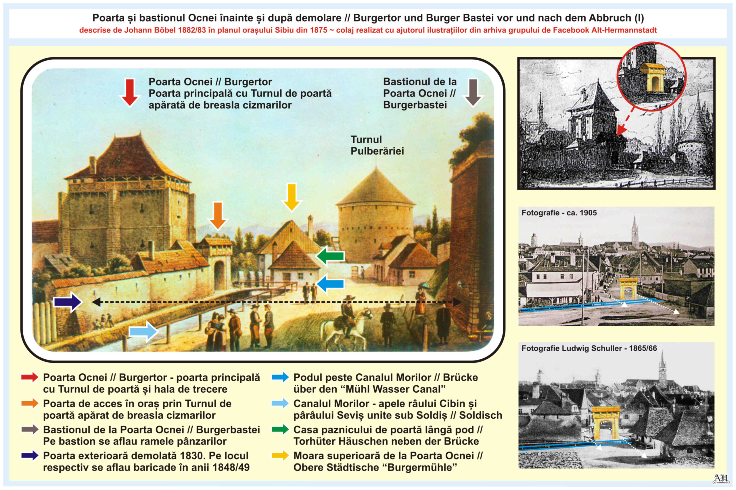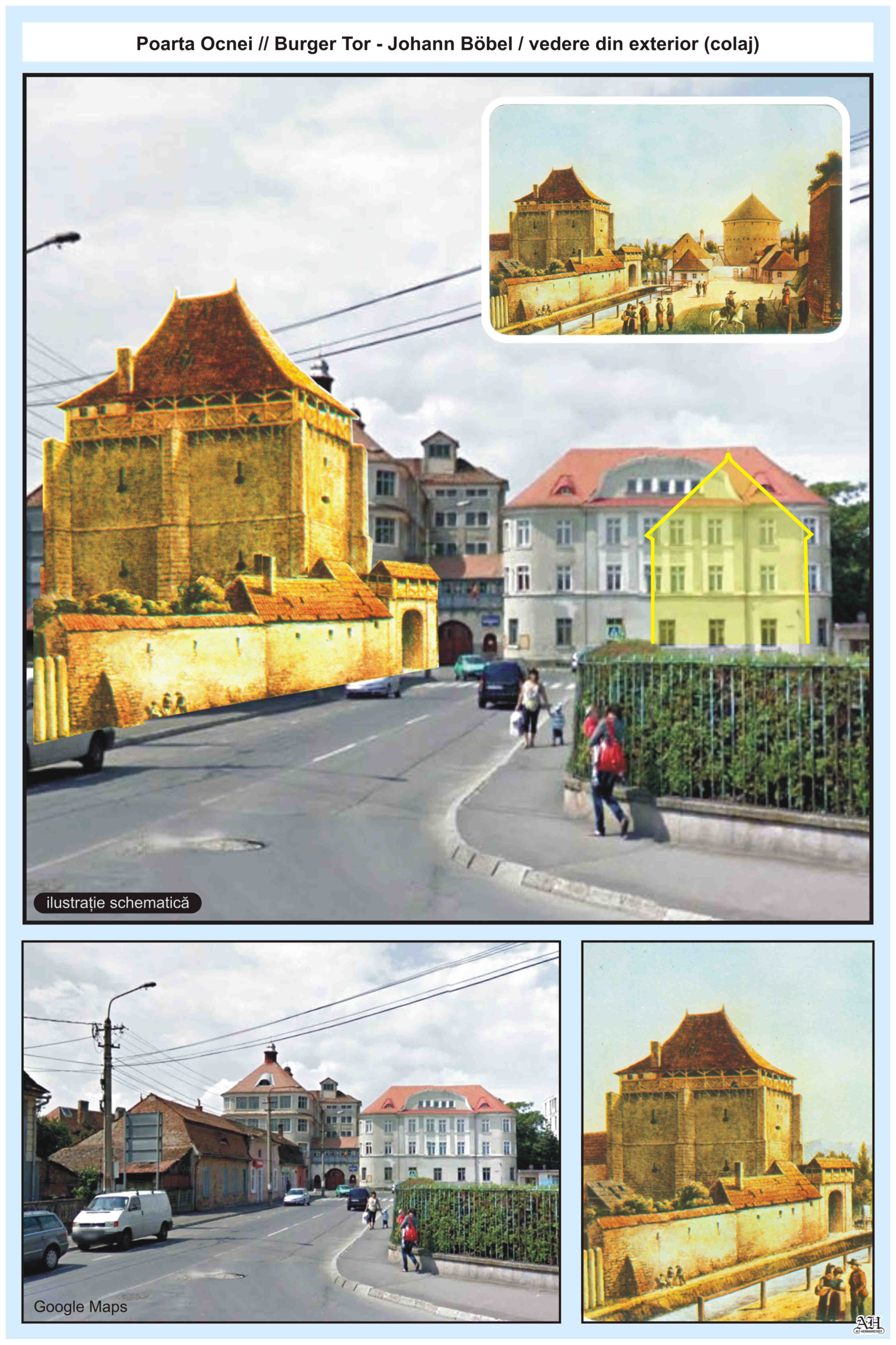 Lângă Poarta Burger/ Ocnei se află Turnul Pulberăriei // Pulverturm, care există și în zilele noastre.Colaje realizate cu ajutorul ilustrațiilor din arhiva personală și arhiva grupului de Facebook Alt-Hermannstadt.