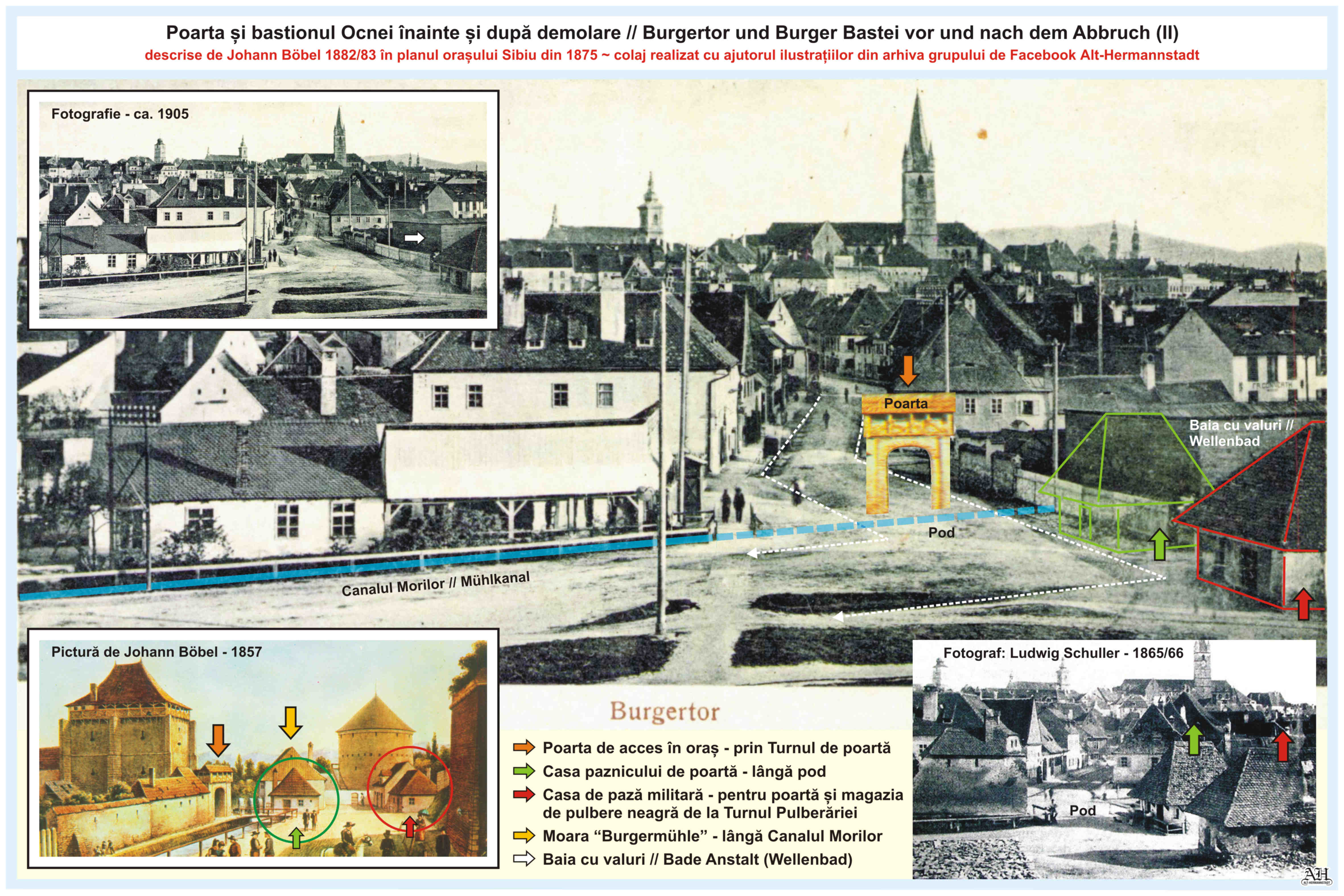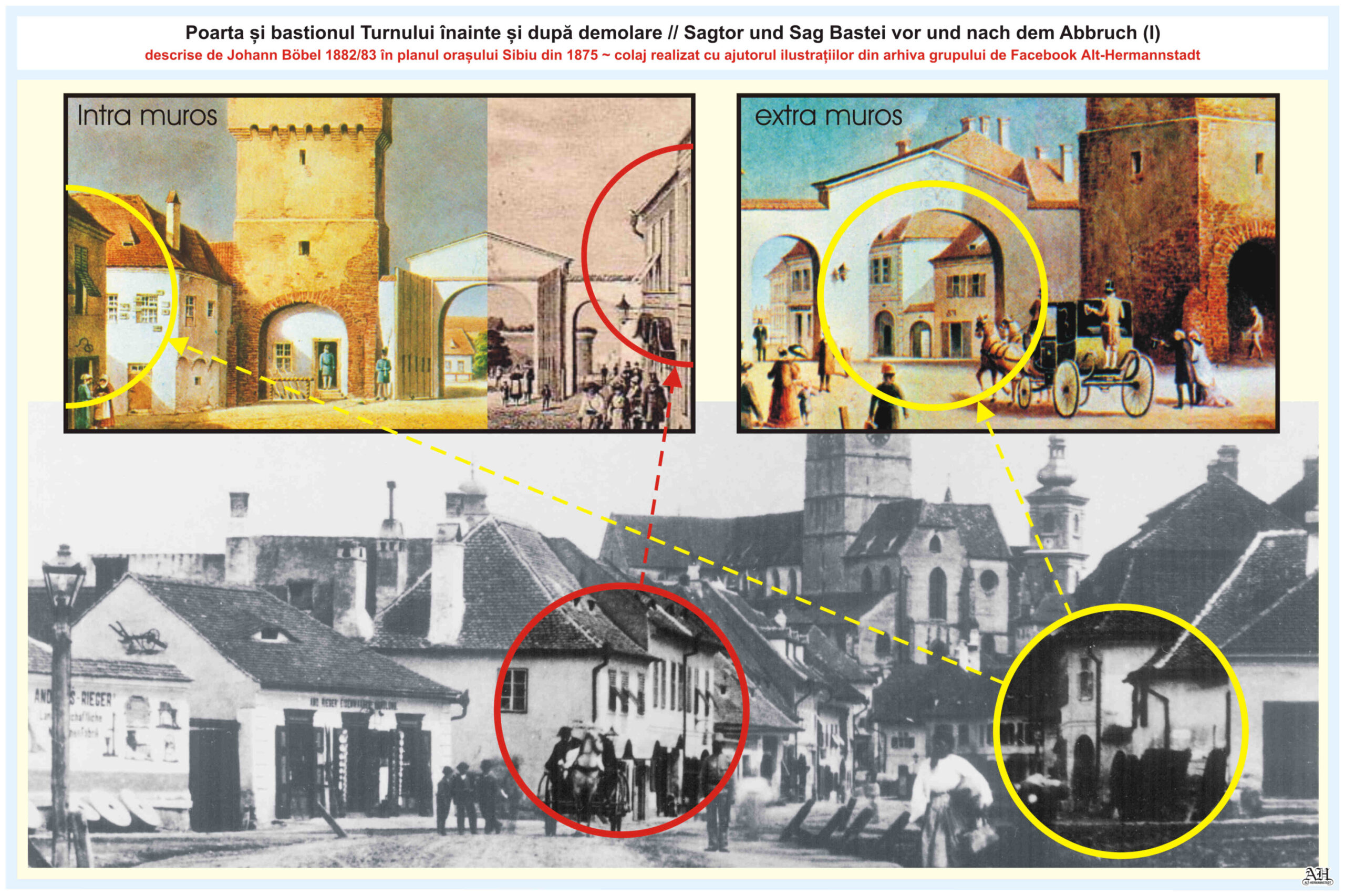 Poarta nouă de trecere construită în 1830 lângă Turnul Croitorilor, a fost demolată, de-asemenea, în 1858.Colaje realizate cu ajutorul ilustrațiilor din arhiva personală și arhiva grupului de Facebook Alt-Hermannstadt.