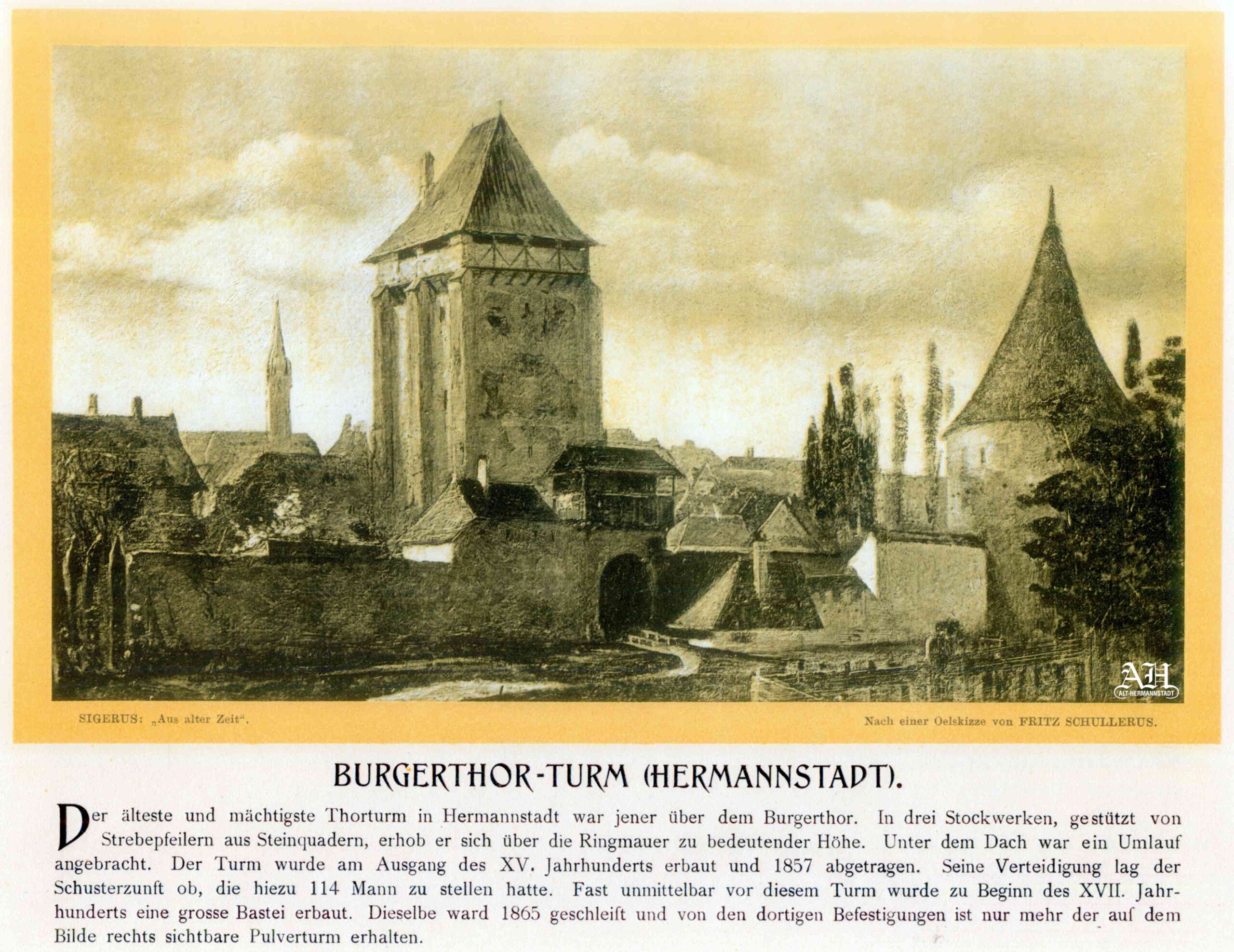 Stânga: Ilustrația realizată după o pictură în ulei de Fritz Schullerus arată Poarta Ocnei/ Burger înainte de demolare. Pe fațada nordică a turnului mare se aflau picturi murale, vizibile și în pictura lui Fritz Schullerus. Ilustrația a fost realizată pentru albumul „Aus Alter Zeit“ // „Din vremuri vechi“ editat de Emil Sigerus 1903, tipărit la Institulul tipografic sibian „Kunstanstalt Jos. Drotleff, Hermannstadt“ în 1904. Albumul conține 50 de reproduceri realizate prin procedeul tiparului în dublu ton // Doppelton-Lichtdruck – colecția Helmut Wolff (anterior Langstein).