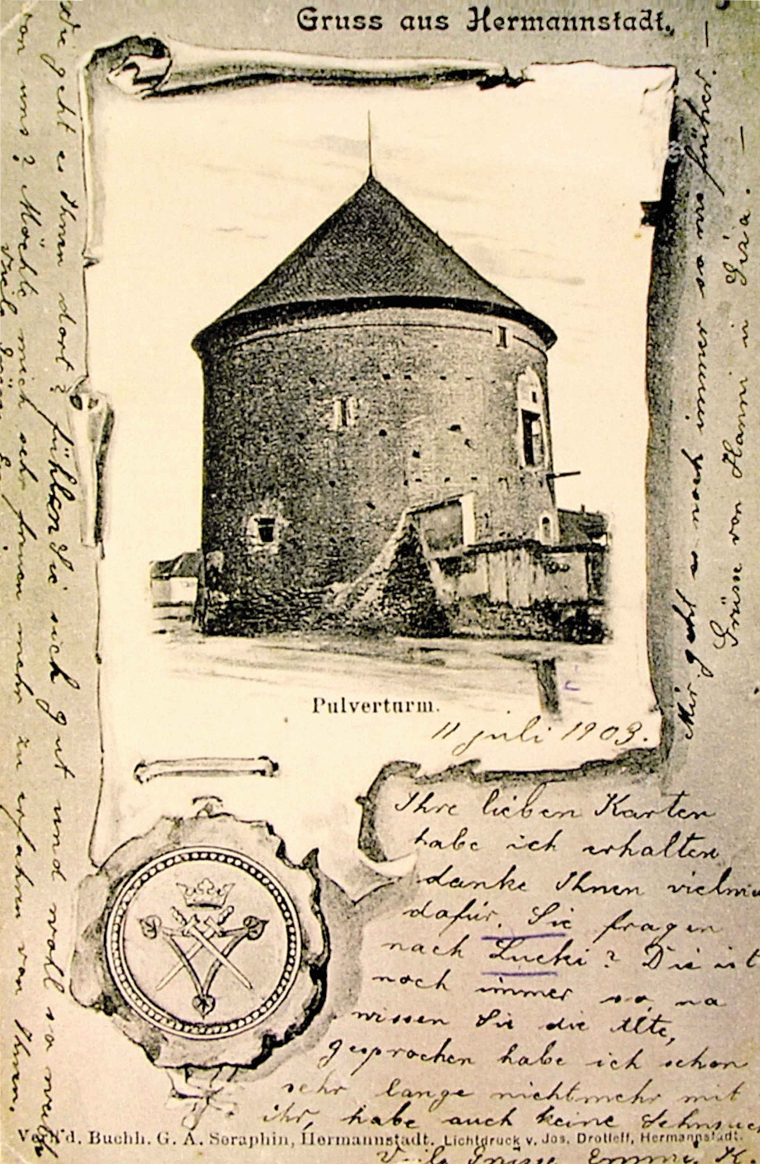 Dreapta: Carte poștală inscripționată cu textul – „Gruss aus Hermannstadt” // „Salutări din Sibiu” – ilustrată cu Turnul Pulberăriei // Pulverturm, circulată în 1903.