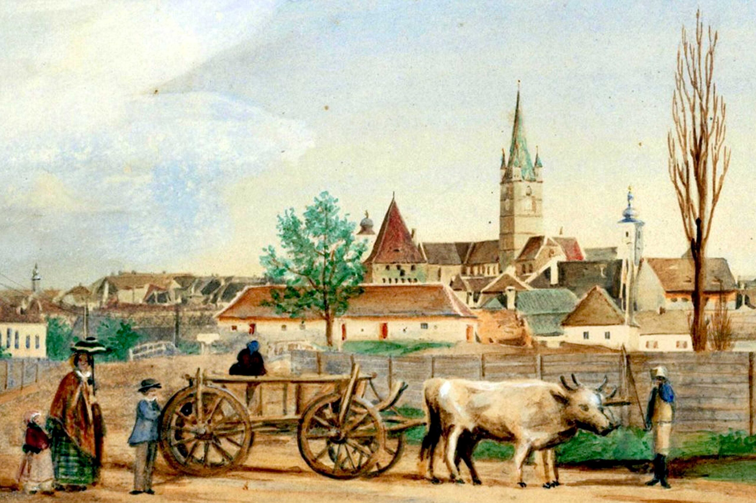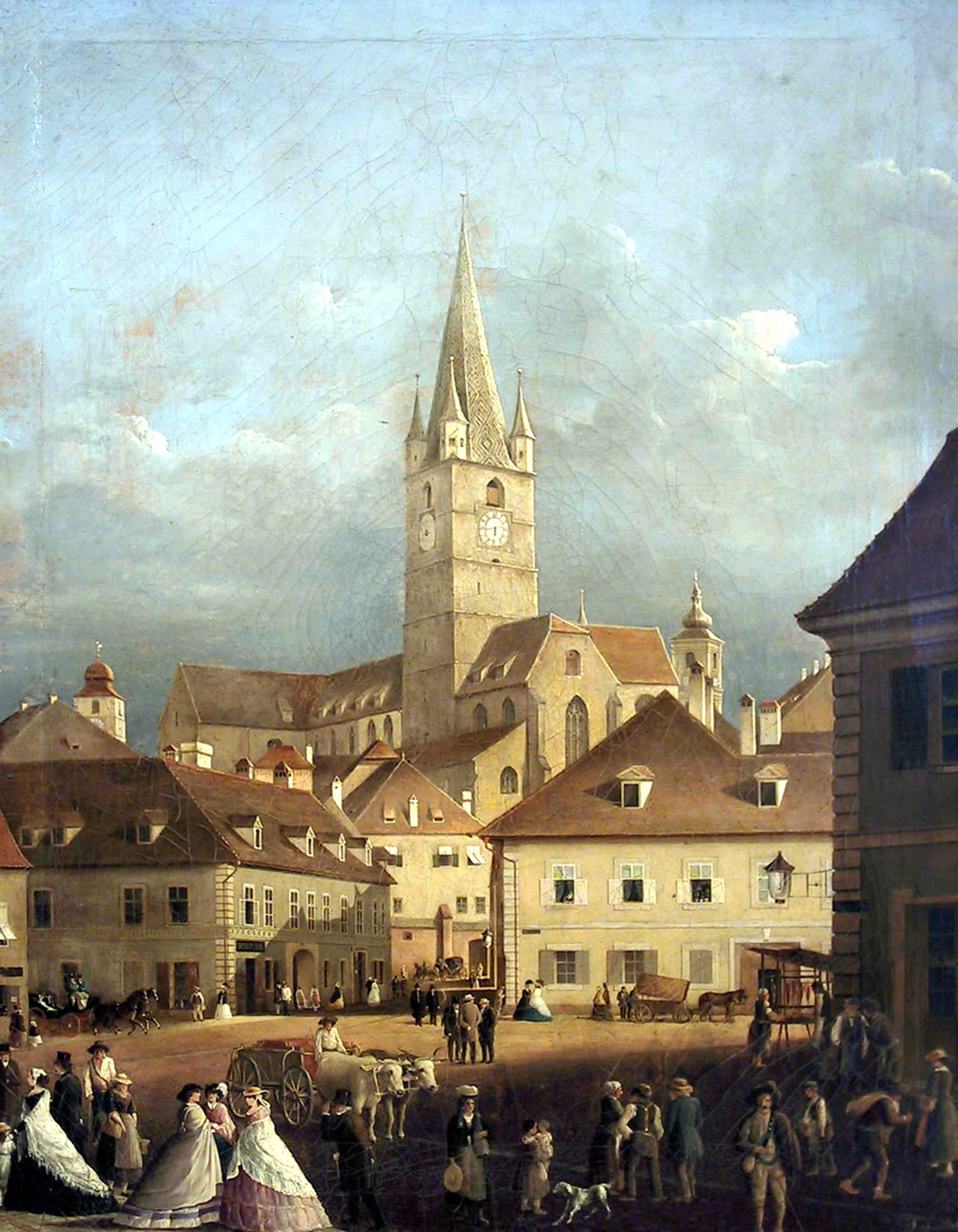 Strada Sag / Turnului și Biserica Evanghelică ~ pictură realizată de renumitul artist sibian Johann Böbel 1864 (ilustrație din arhiva grupului de Facebook Alt-Hermannstadt)