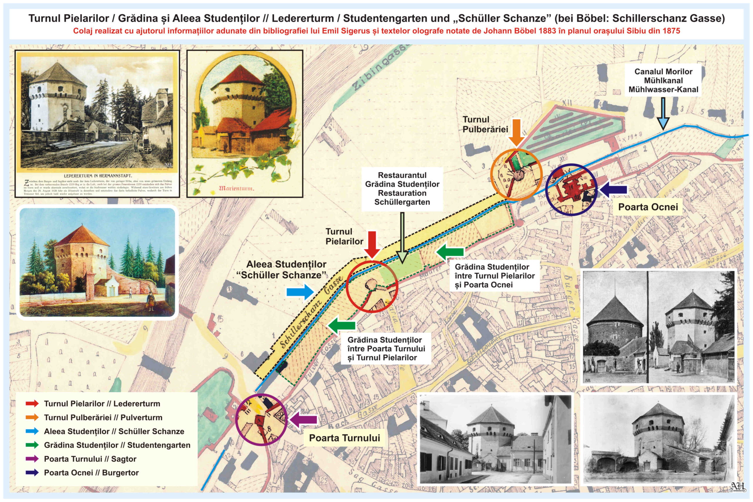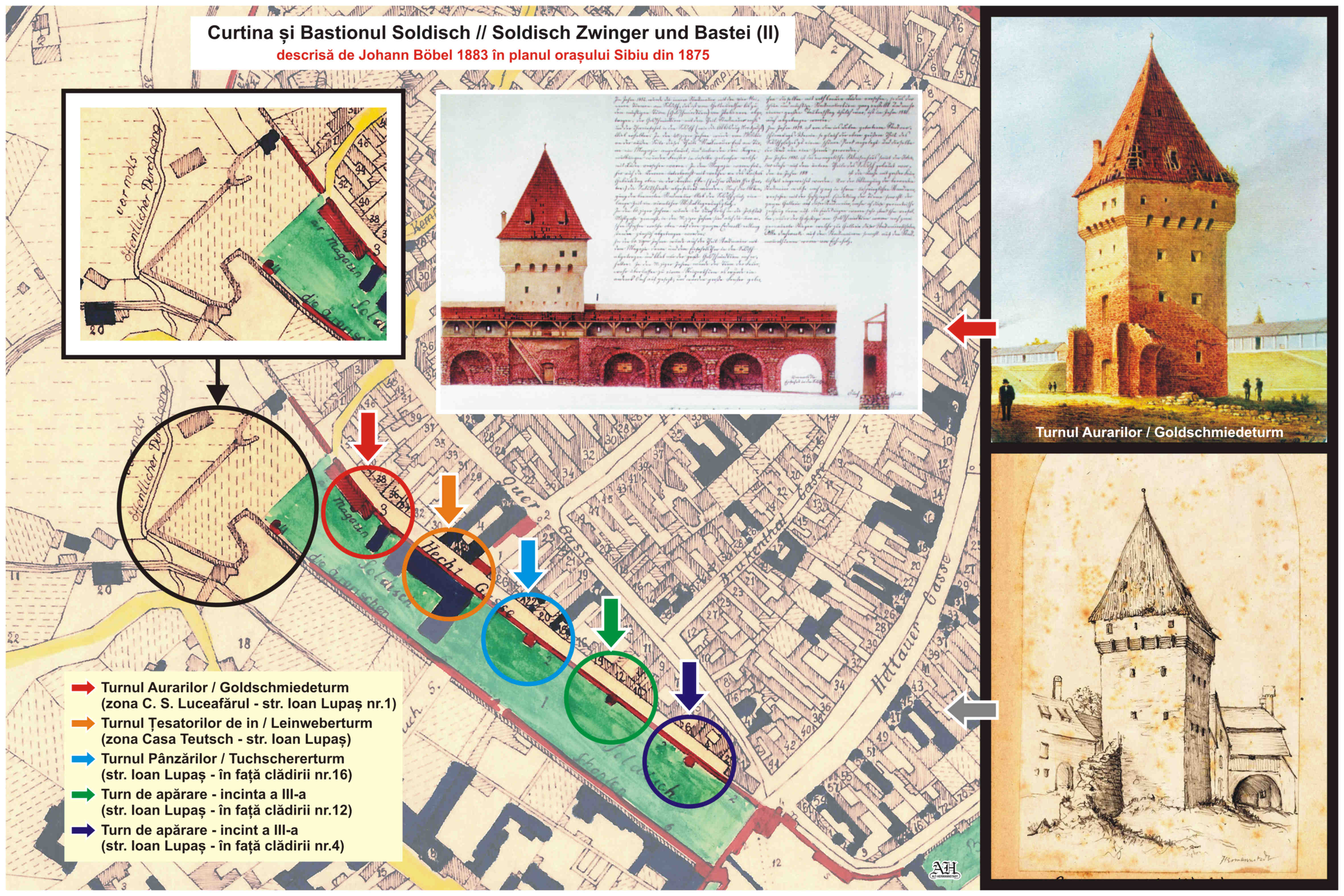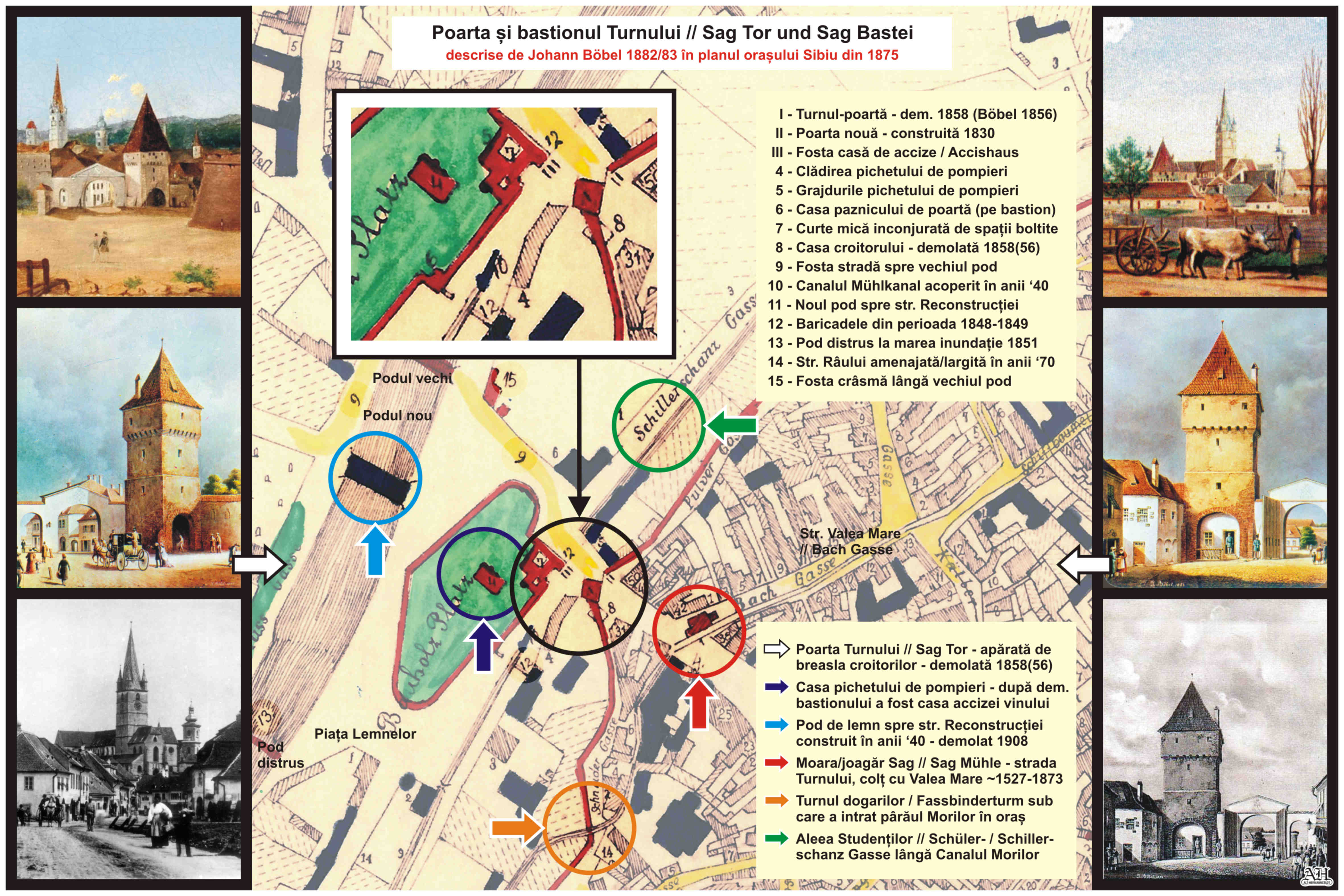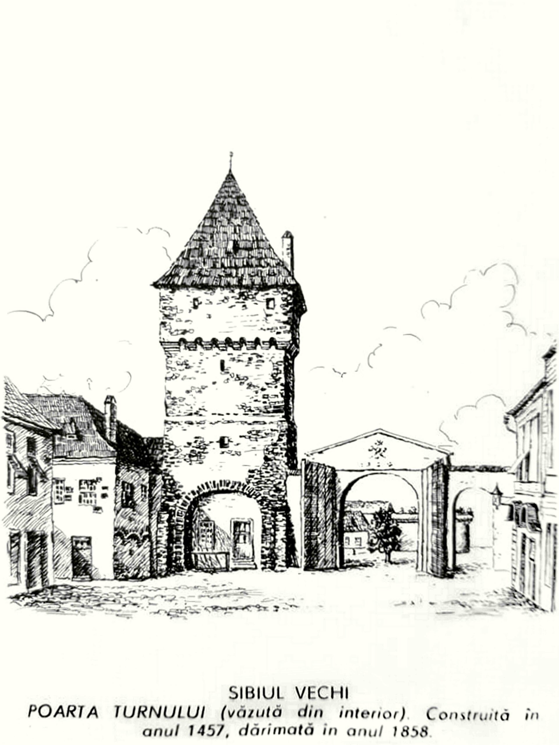 În anul 1882/83 Johann Böbel desenează, notează şi descrie într-o harta din 1875 modificările care au avut loc în oraşul Sibiu în sec.19, între 1830 și 1882. Aici o scurtă descriere a Porţii Turnului // Sag Tor: