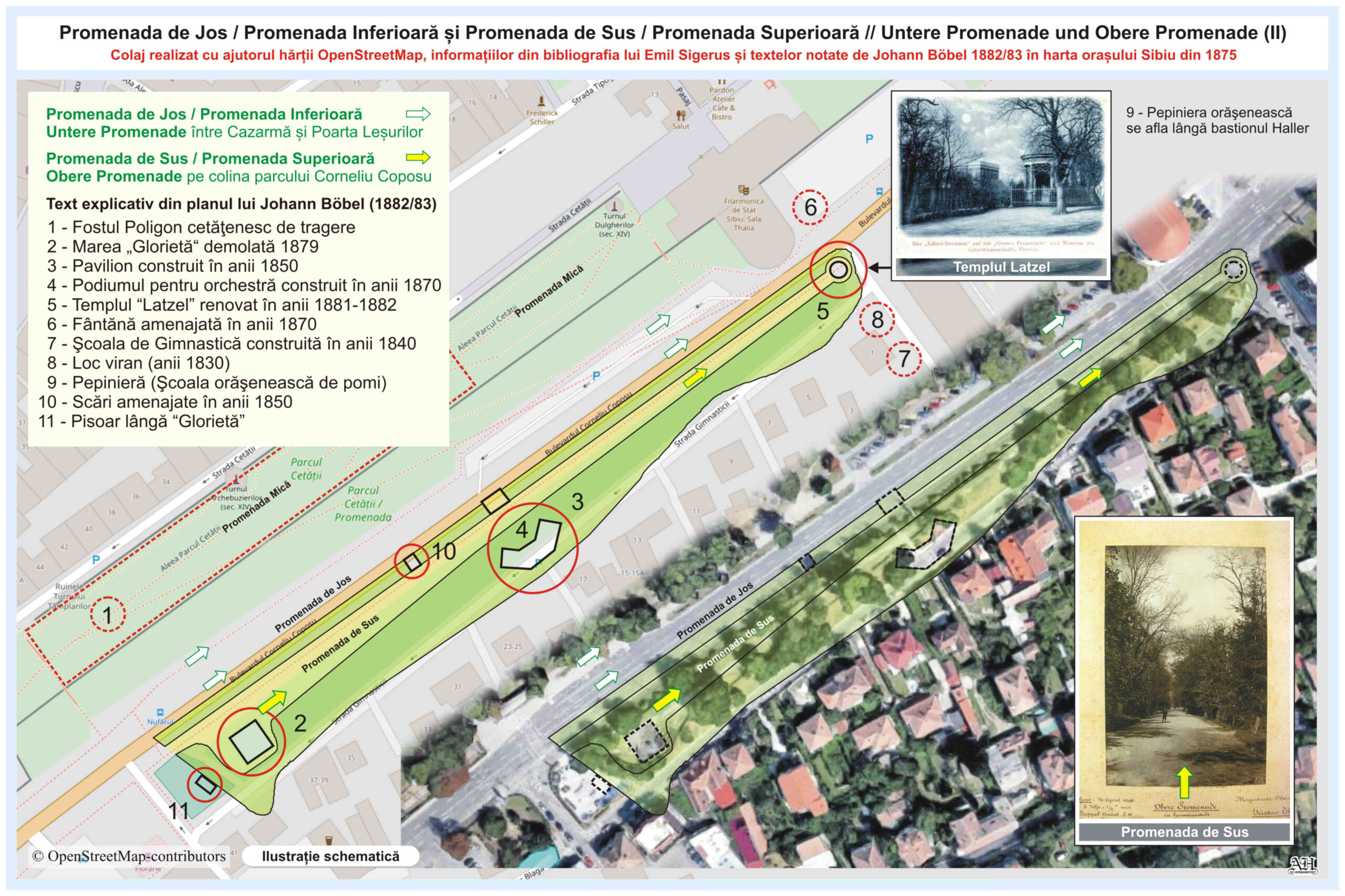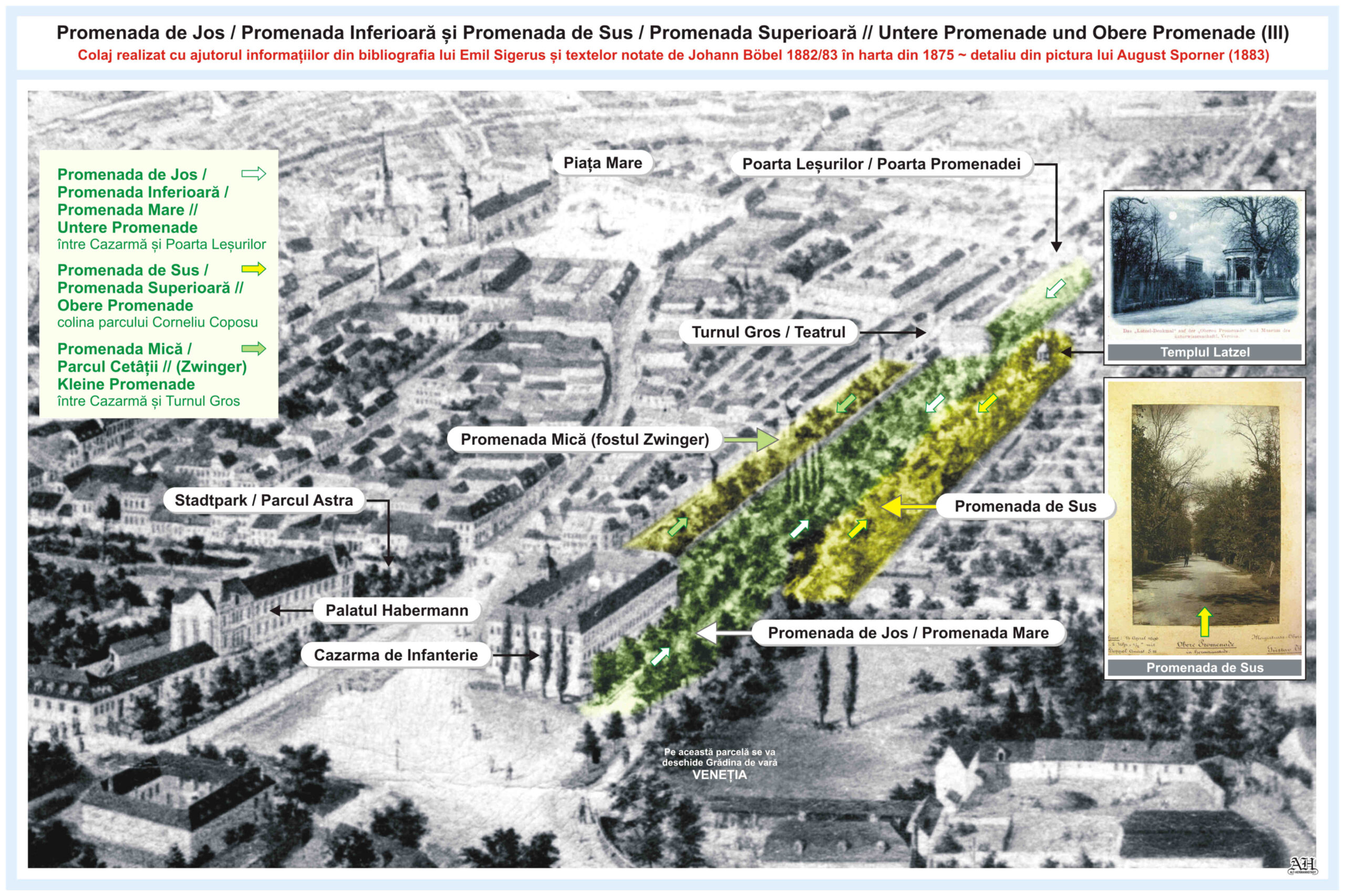 În anul 1882/83 Johann Böbel desenează, notează şi descrie, într-o hartă din 1875, modificările care au avut loc în oraşul Sibiu în sec.19, între 1830-1882/83. Redau aici traducerea si textul original referitor la suburbia Cartierul Josefin și Promenada Arinilor, situate în partea sud-sud/vestică a orașului: