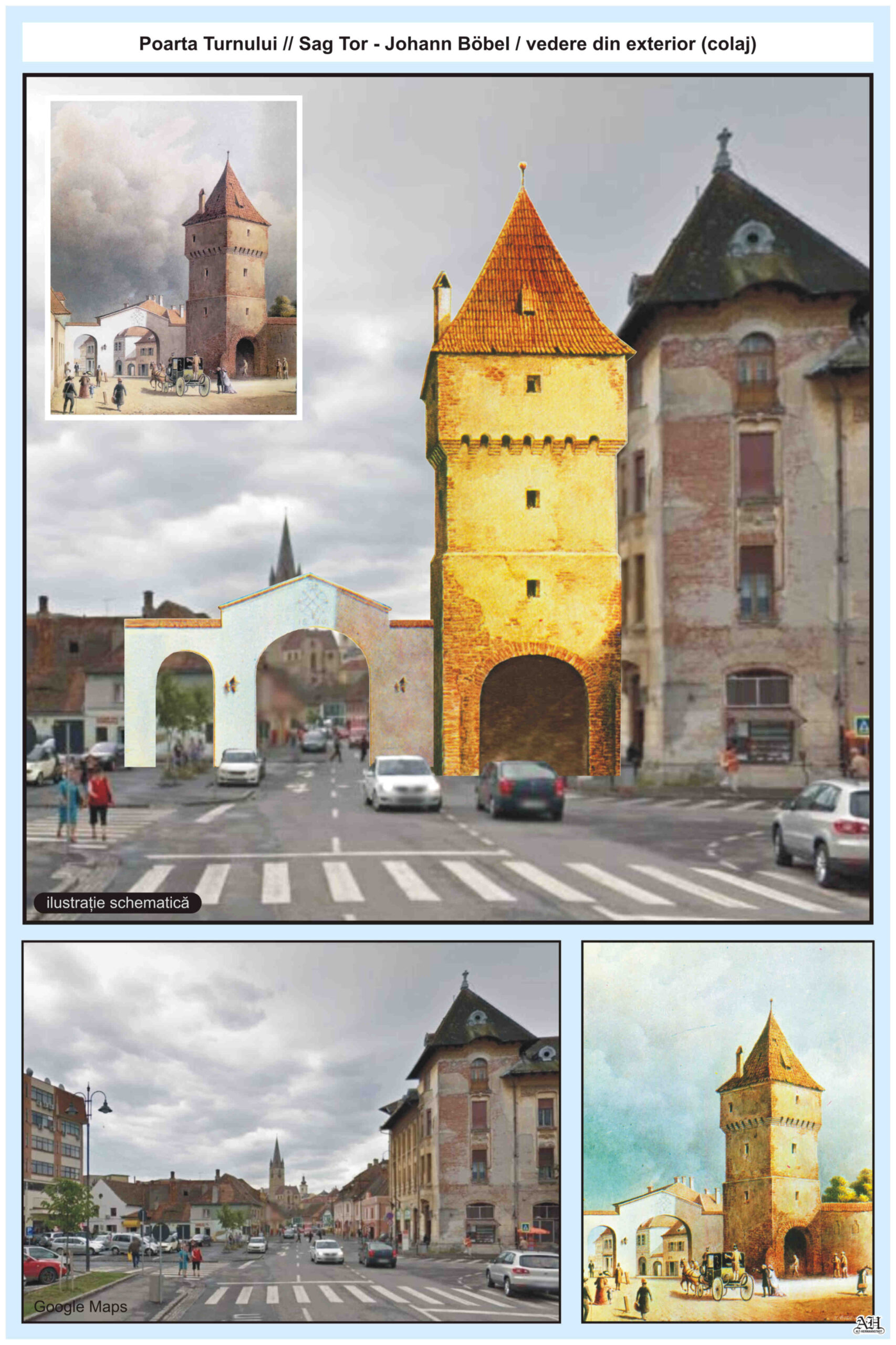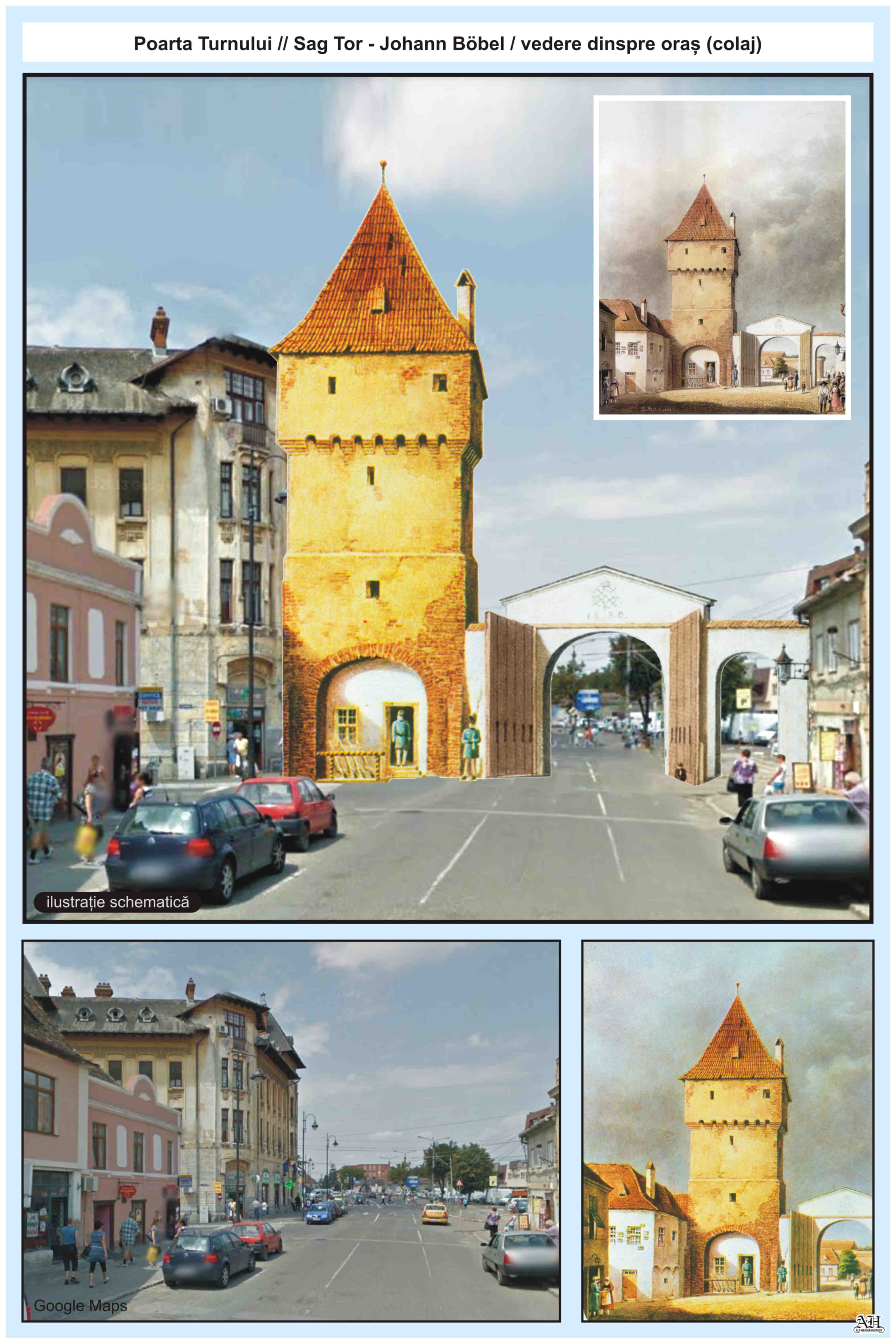 Dreapta: Poarta Sag/ Turnului văzută dinspre oraș. Ilustrație din ciclul „Sibiul vechiu – Alt-Hermannstadt” cu descriere bilingvă. - Alt-Hermannstadt // Sibiu // Nagyszeben, Böbel| Plan 1882/83 // Planul Böbel 1882/83, Collagen // Colaje, Johann Böbel