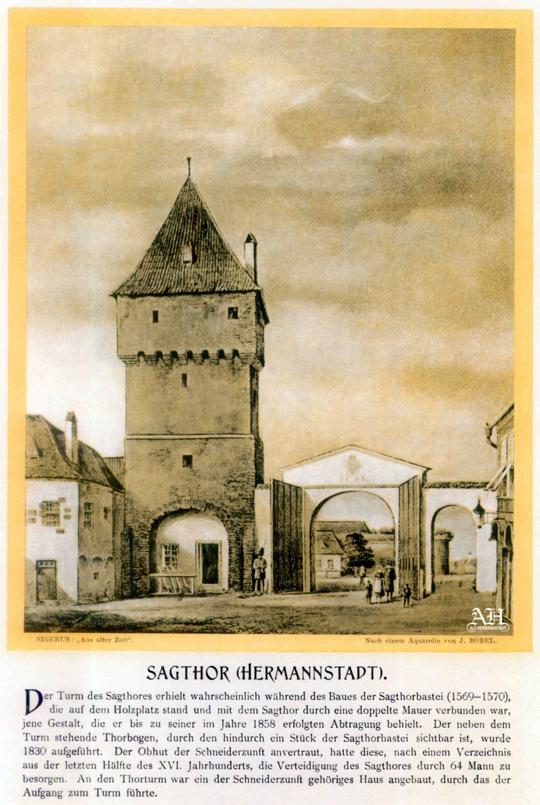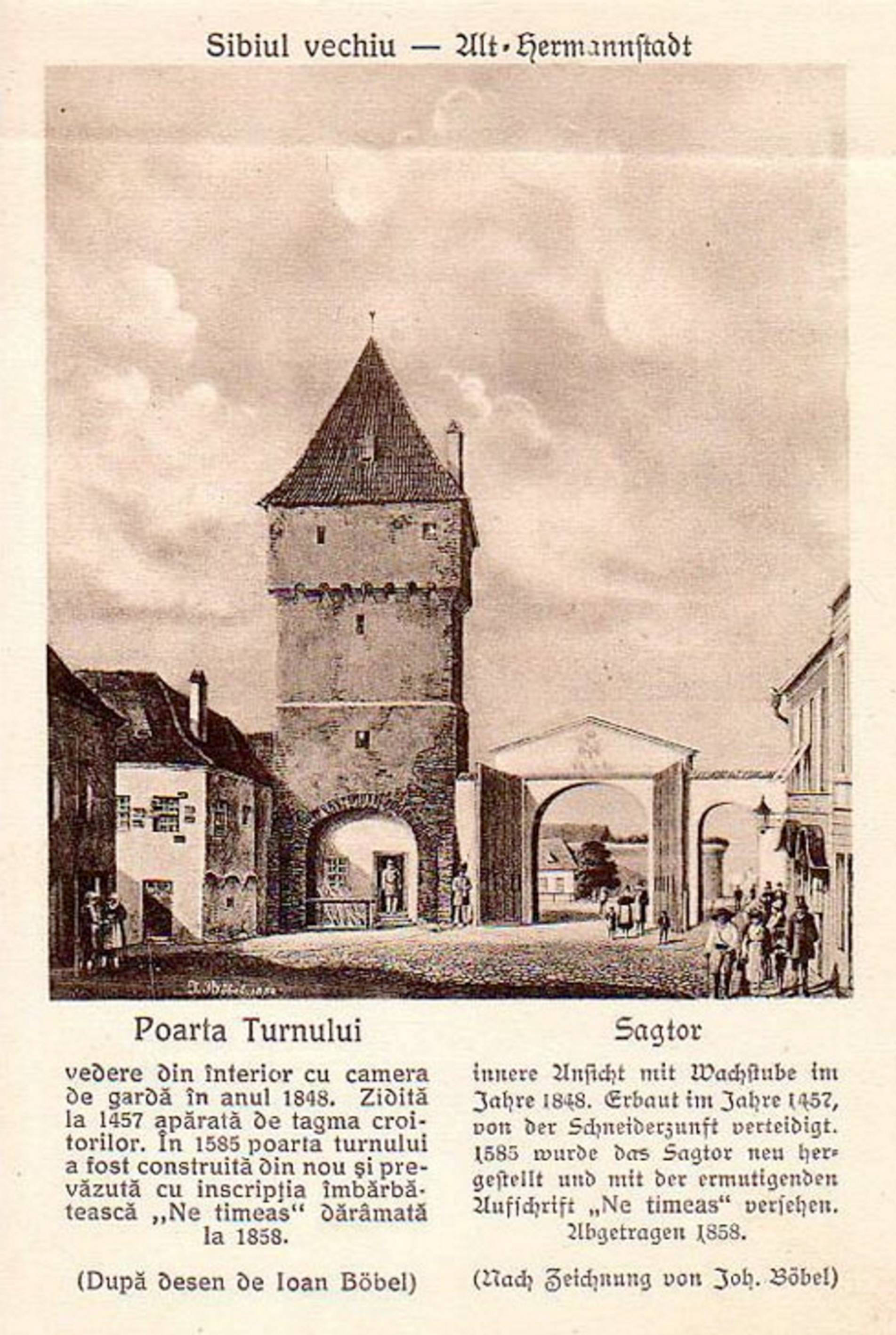 Stânga: „Johann Böbel – Poarta Sag din Sibiu, vedere din exterior (demolată în 1858)“ // „Das Hermannstädter Sagtor, Aussenansicht (abgetragen 1858)“ – Carte Poștală, dintr-un set cu picturi executate de Johann Böbel, tipărite la Intreprinderea Poligrafică Sibiu. Pictură realizată de Johann Böbel în 1858.