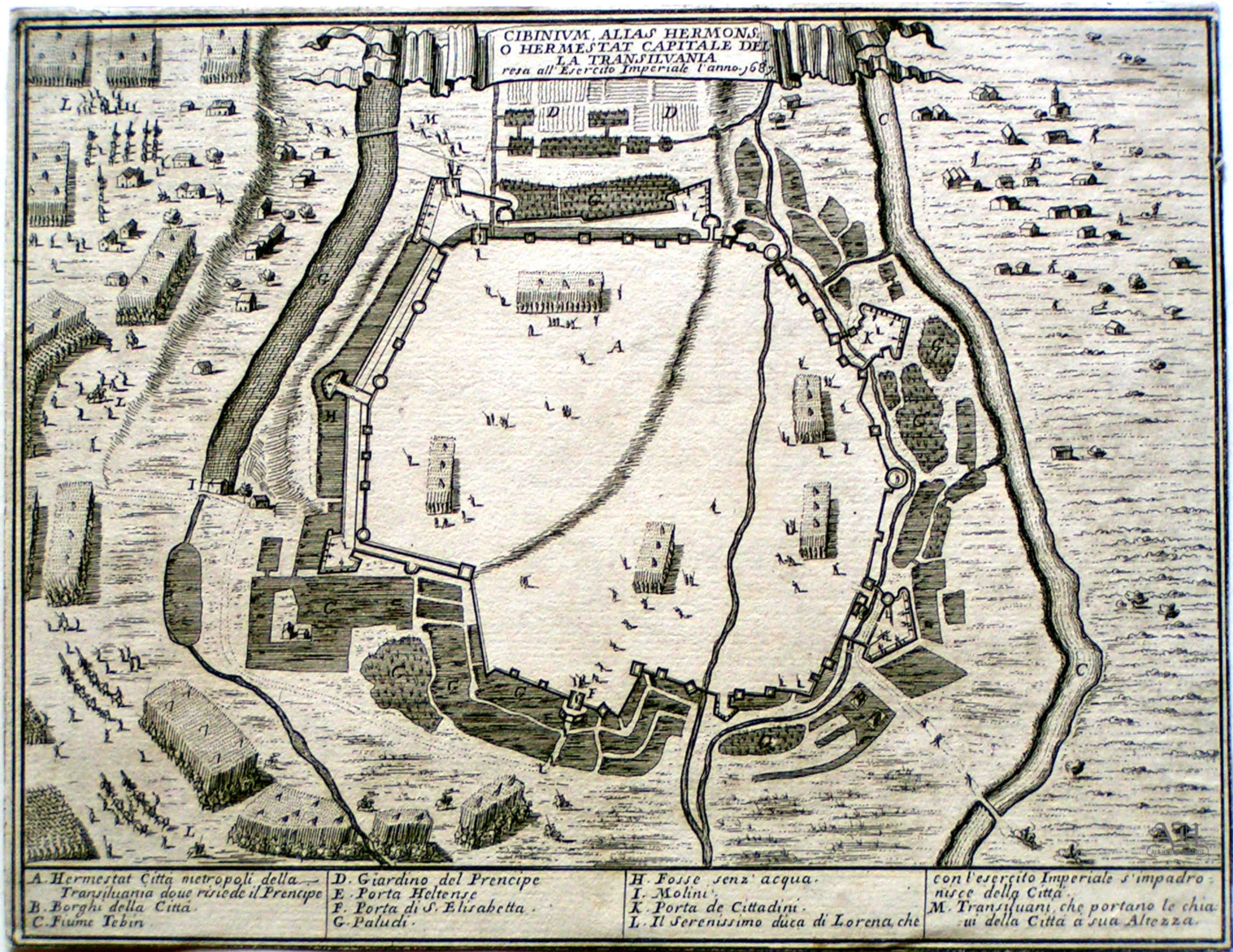 „Cibinium alias Hermons. o Hermestat Capitale Della Transilvania.resa all-Esercito Imperiale l-anno.1687“ ~ Giovanni Giacomo Rossi