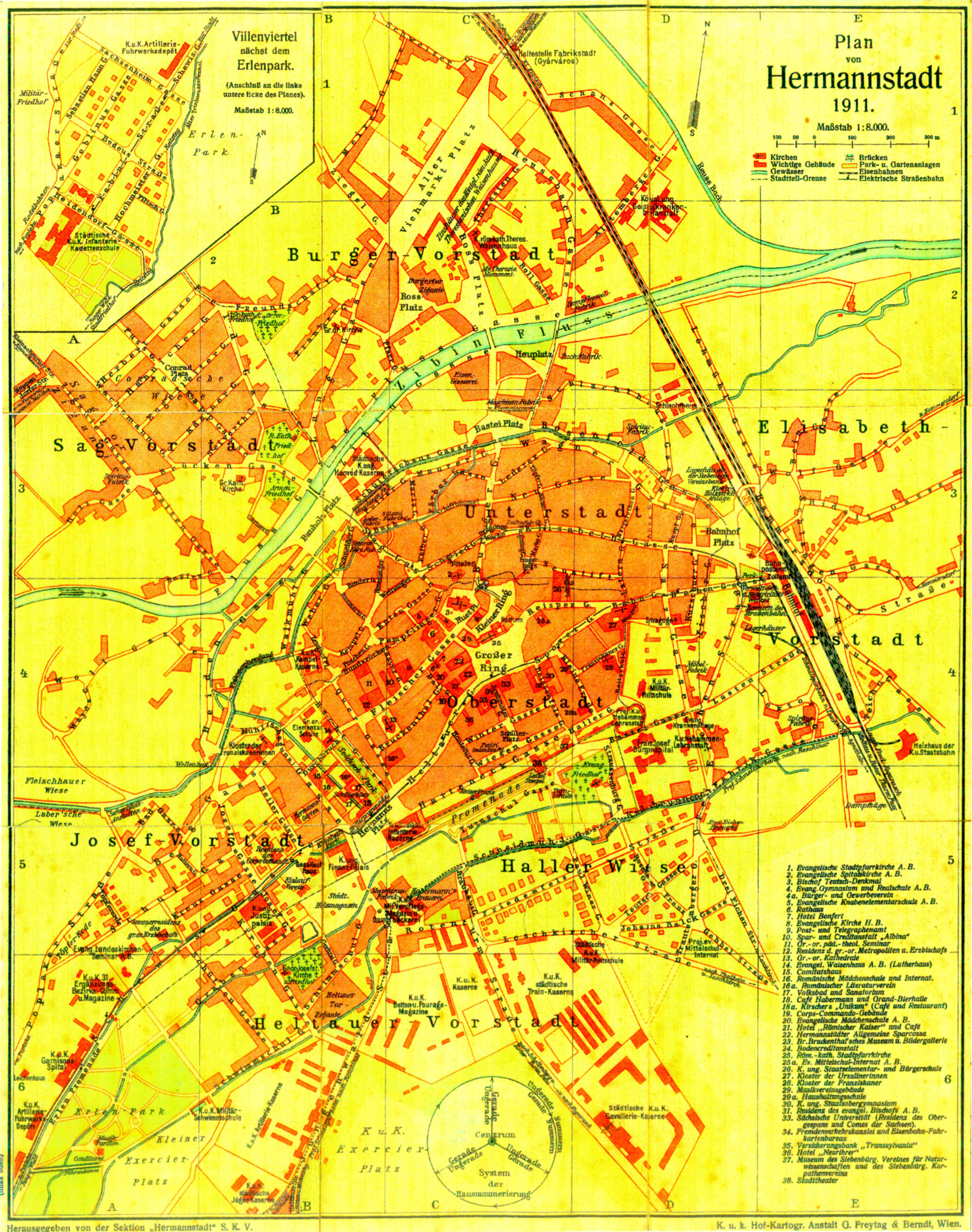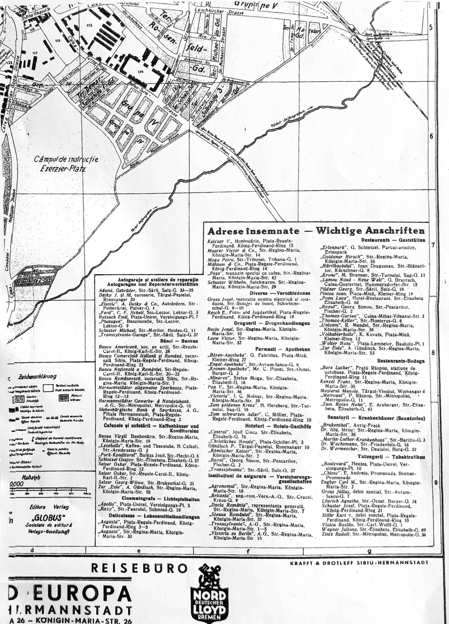 Legenda planului prezintă urmatoarele Adrese însemnate // Wichtige Anschriften: