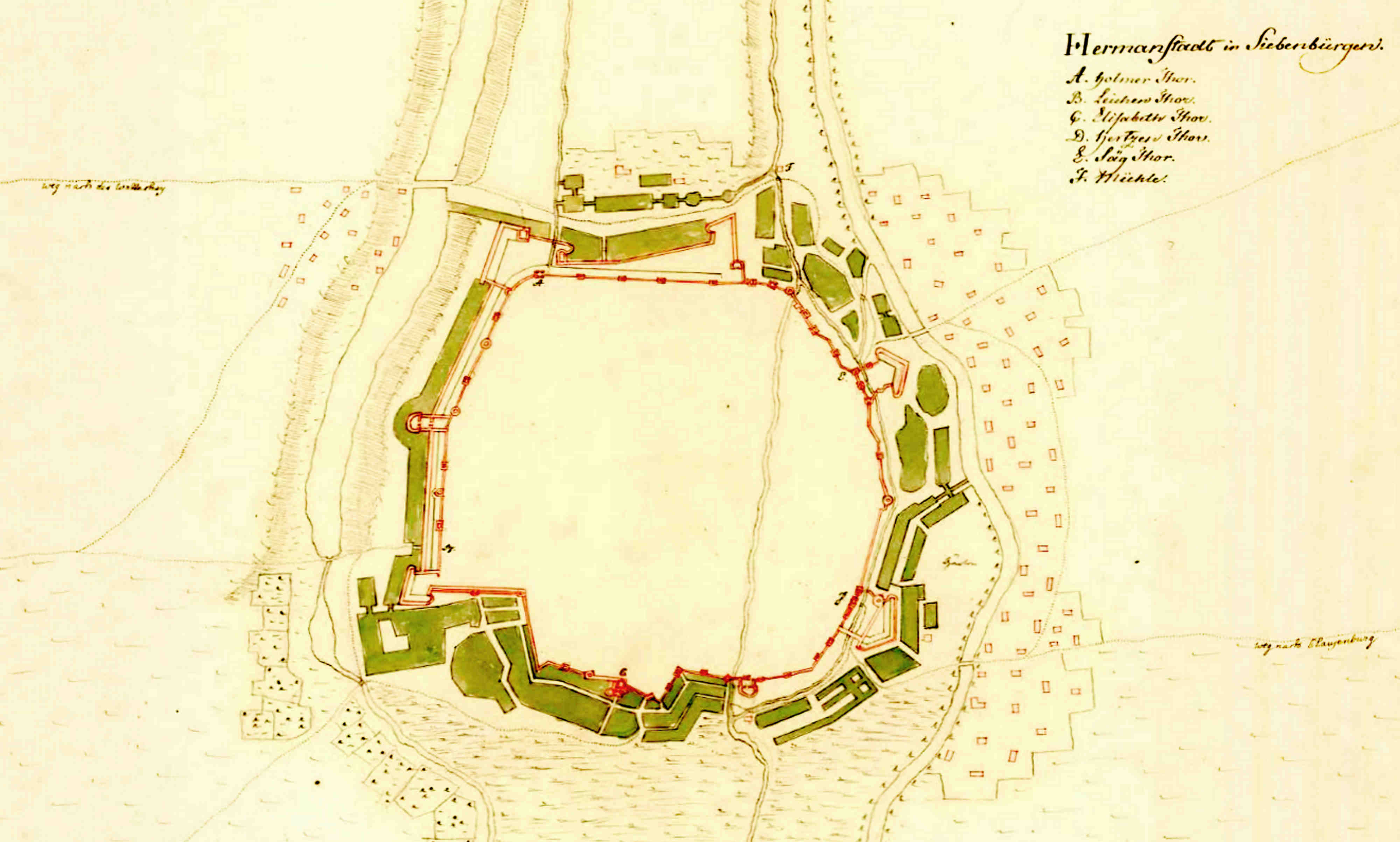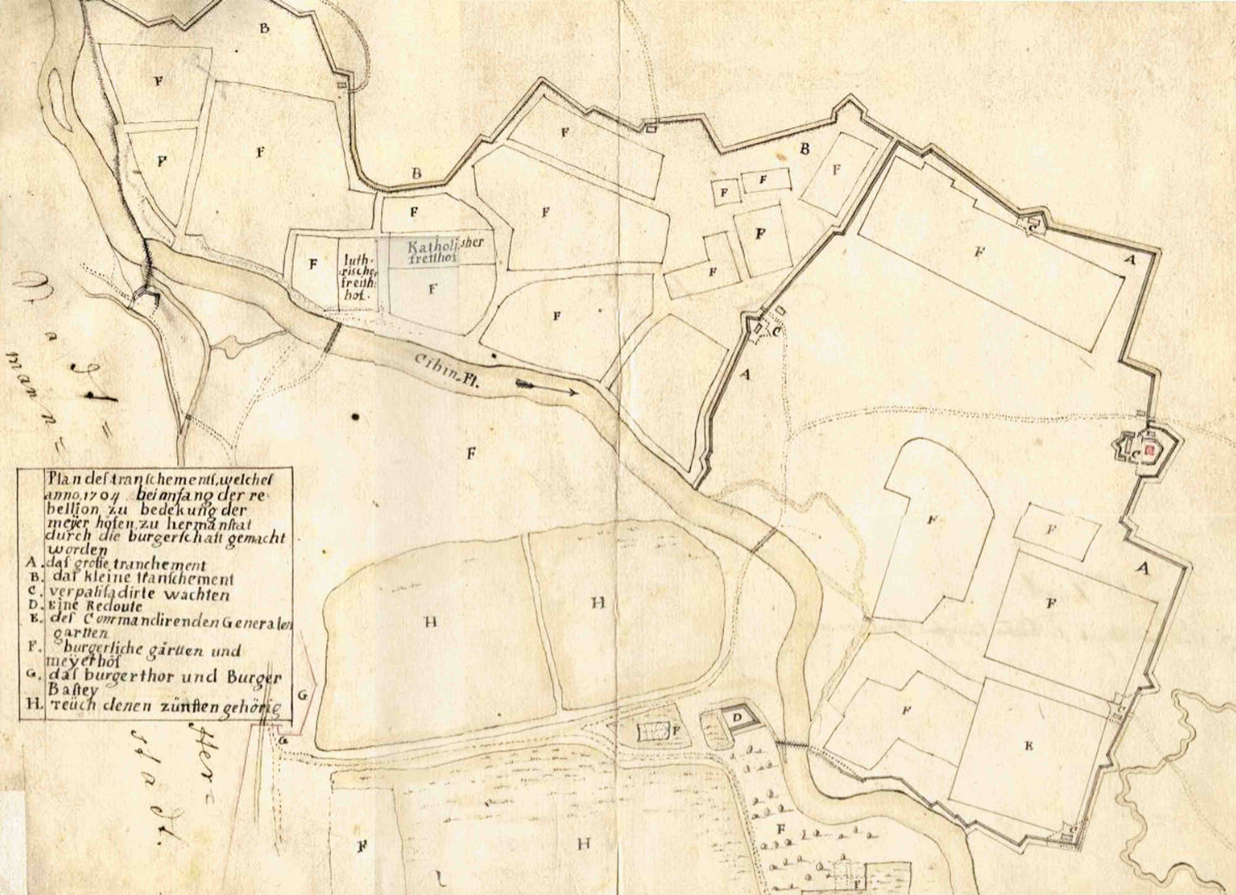 „Plan des tranchements, welches anno 1704 bei anfang der rebellion zu bedekung der meijer höfen zu hermanstat durch die burgerschaft gemacht worden.“ (Planul retranșamentului construit de cetățenii orașului la începutul rebeliunii din anul 1704 pentru apărarea grădinilor maierene sibiene.)
