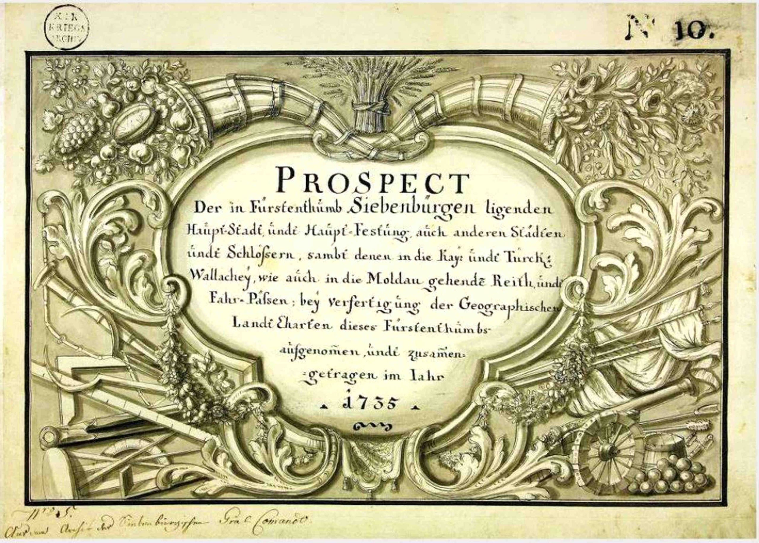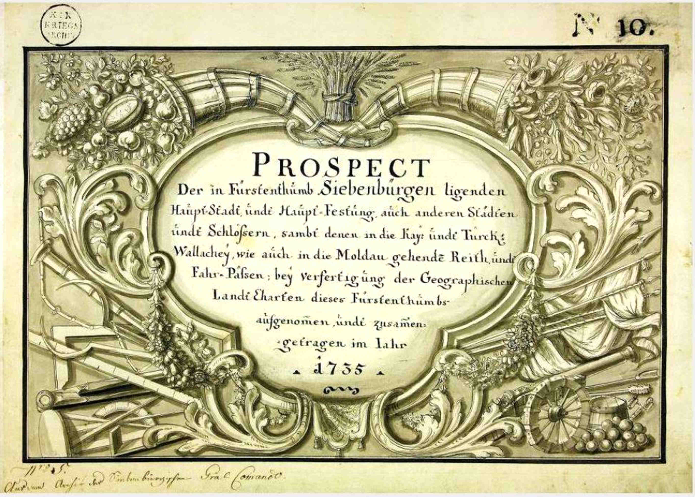 Textul original: Prospect der in Fürstenthumb Siebenbürgen ligenden Haupt-Stadt, undt Haupt-Festung, auch anderen Städten undt Schlössern, sambt denen in die Kayz undt Türck: Wallachey, wie auch in die Moldau gehende Reith undt Fahr-Pässen: bey verfertigung der Geographischen LandtCharten dieses Fürstenthumbs aufgenommen undt zusammengetragen im Jahr 1735.