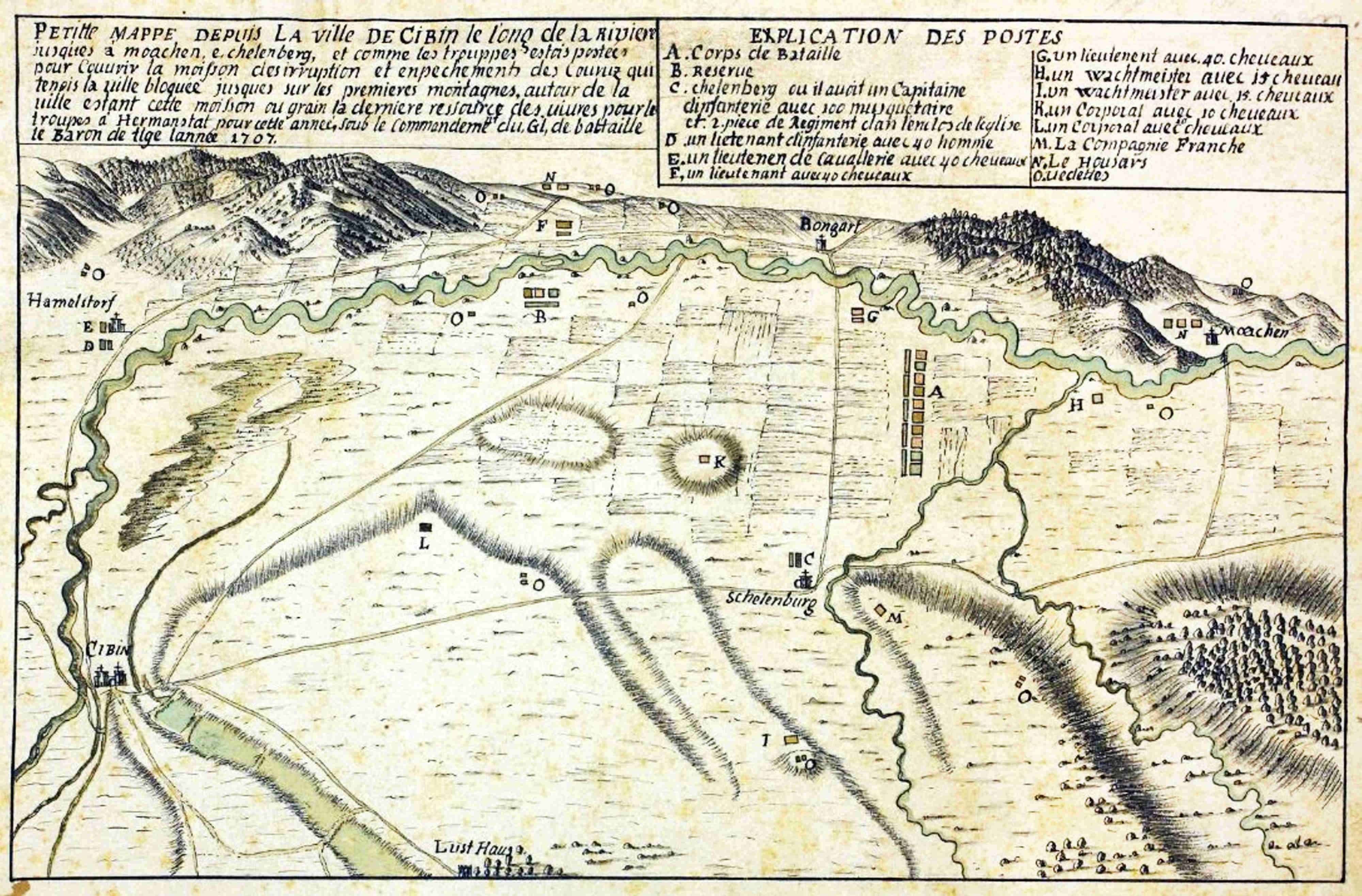 PETITTE MAPPE DEPUIS LA VILLE DE CIBIN le long de la Riviere jusques à moachen e chelenberg, et comme les trouppes estois postees pour couvrir la moisson des irruption et enpechements des Couruz qui tenois la ville bloque jusque sur les premieres montagnes, autour de la ville estant cette moisson ou grain la dernier ressource des vivres pour le troupes à Hermanstat pour cette année, soub le commandement du Gl, de battaille le Baron de tige lannée 1707.