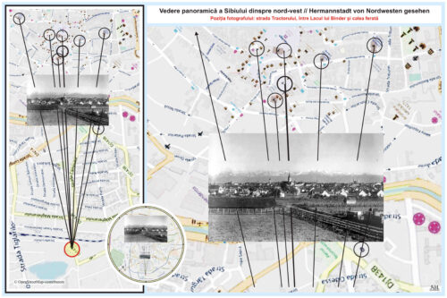 Colajul al doilea arată poziția fotografului. Fotografia din partea superioară, în care se vede podul de cale ferată, a fost realizată din zona Spitalul de Psihiatrie „Dr. Gheorghe Preda“. (sursa foto: „Alt-Hermannstadt“)