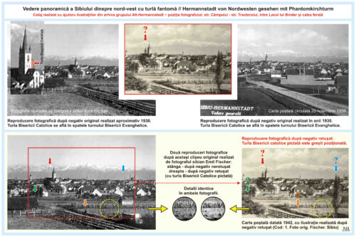 Varianta retușată apare pe o carte poștală inscripționată cu textul: Sibiu. 1942. Cod: 1. Foto orig. Fischer. Sibiu.A treia ilustrație arată veduta orașului Sibiu fotografiată la sfârșitul anilor 1930. Această fotografie apare pe o carte poștală circulată în luna noiembrie 1939.