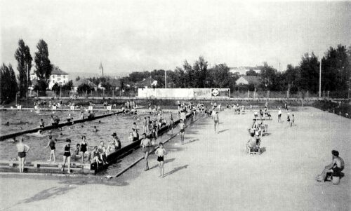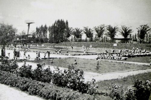 Două fotografii datate în a doua jumătate a anilor 1930. Fotografia din partea stângă a fost realizată după deschiderea strandului în 1936. În fotografia din partea dreaptă realizată în 1939 se vede bazinul pentru copii.