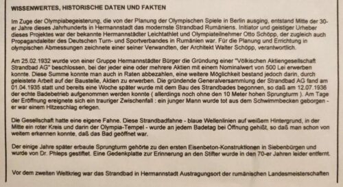 Vor dem zweiten Weltkrieg war das Strandbad in Hermannstadt Austragungsort der rumänischen Landesmeisterschaften.” (textul original în limba germană)