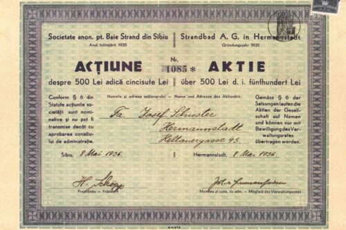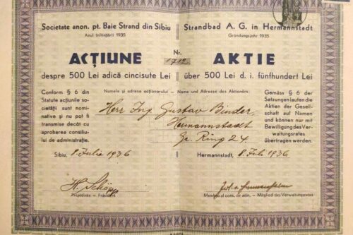 Două acțiuni de câte 500 Lei emise în 1936 de „Societatea anonimă pentru Baie Strand din Sibiu” // „Strandbad AG in Hermannstadt”. Stânga: acționar Josef Schuster, domiciliat în Sibiu/ Hermannstadt, strada N. Bălcescu/ Heltauergasse 43. Dreapta: acționar Gustav Binder, domiciliat în Sibiu/ Hermannstadt, Piața Mare/ Großer Ring 24.
