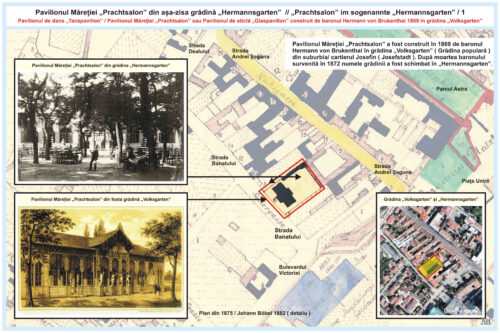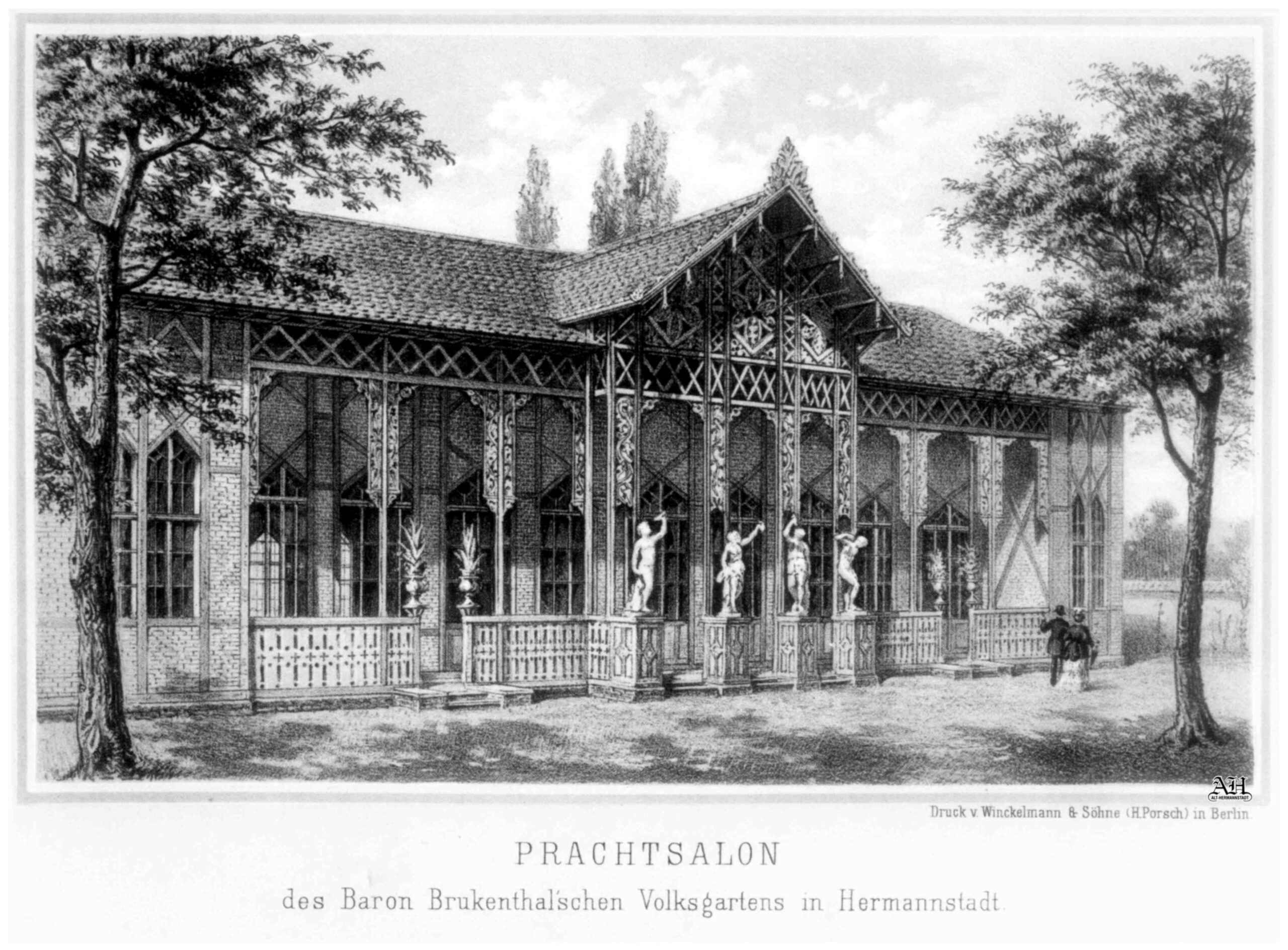 Această litografie deosebit de frumoasă, intitulată, „PRACHTSALON des Baron Brukenthal’schen Volksgartens in Hermannstadt”, a fost tipărită la Institutul litografic Winckelmann & Söhne (H.Porsch) din Berlin.