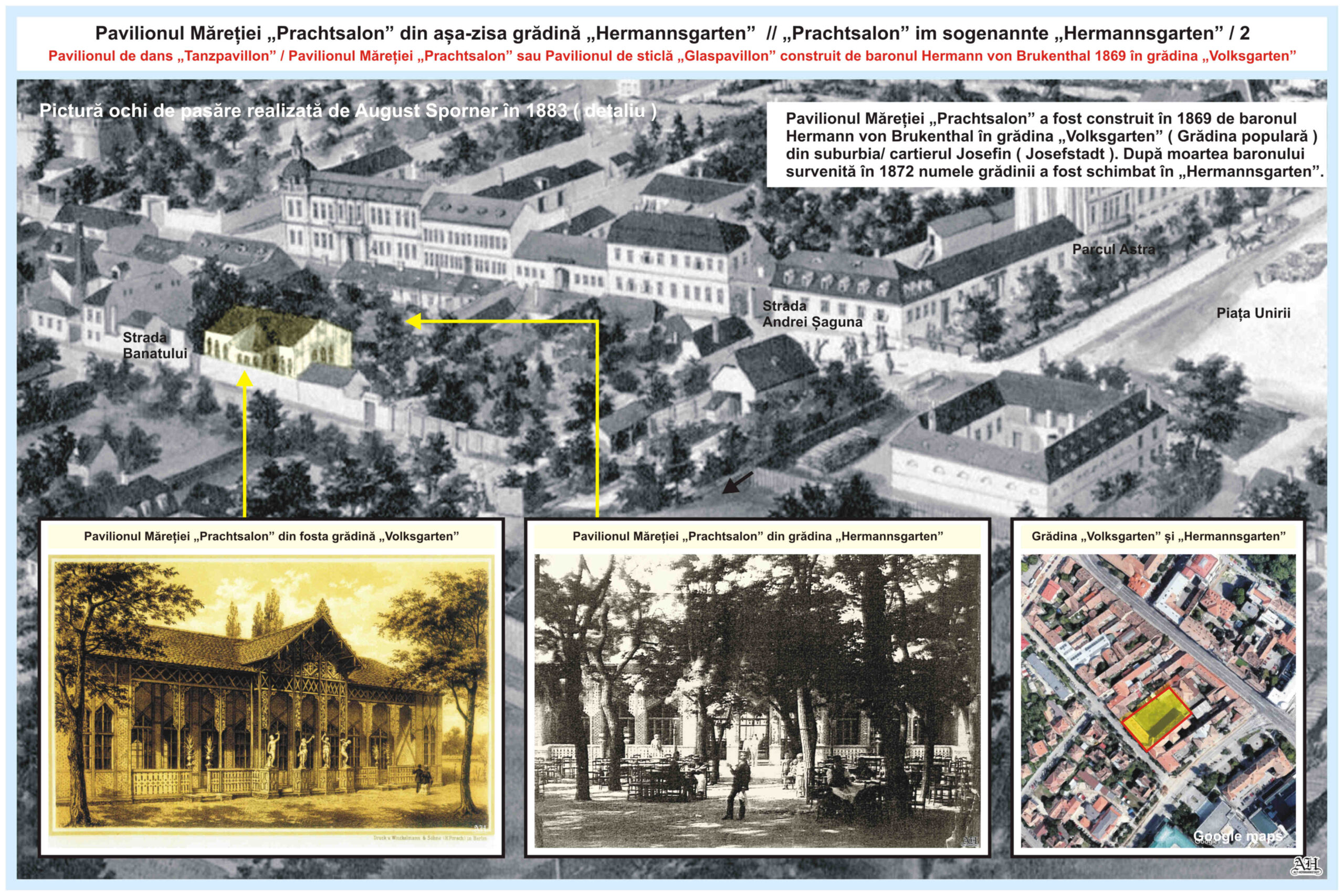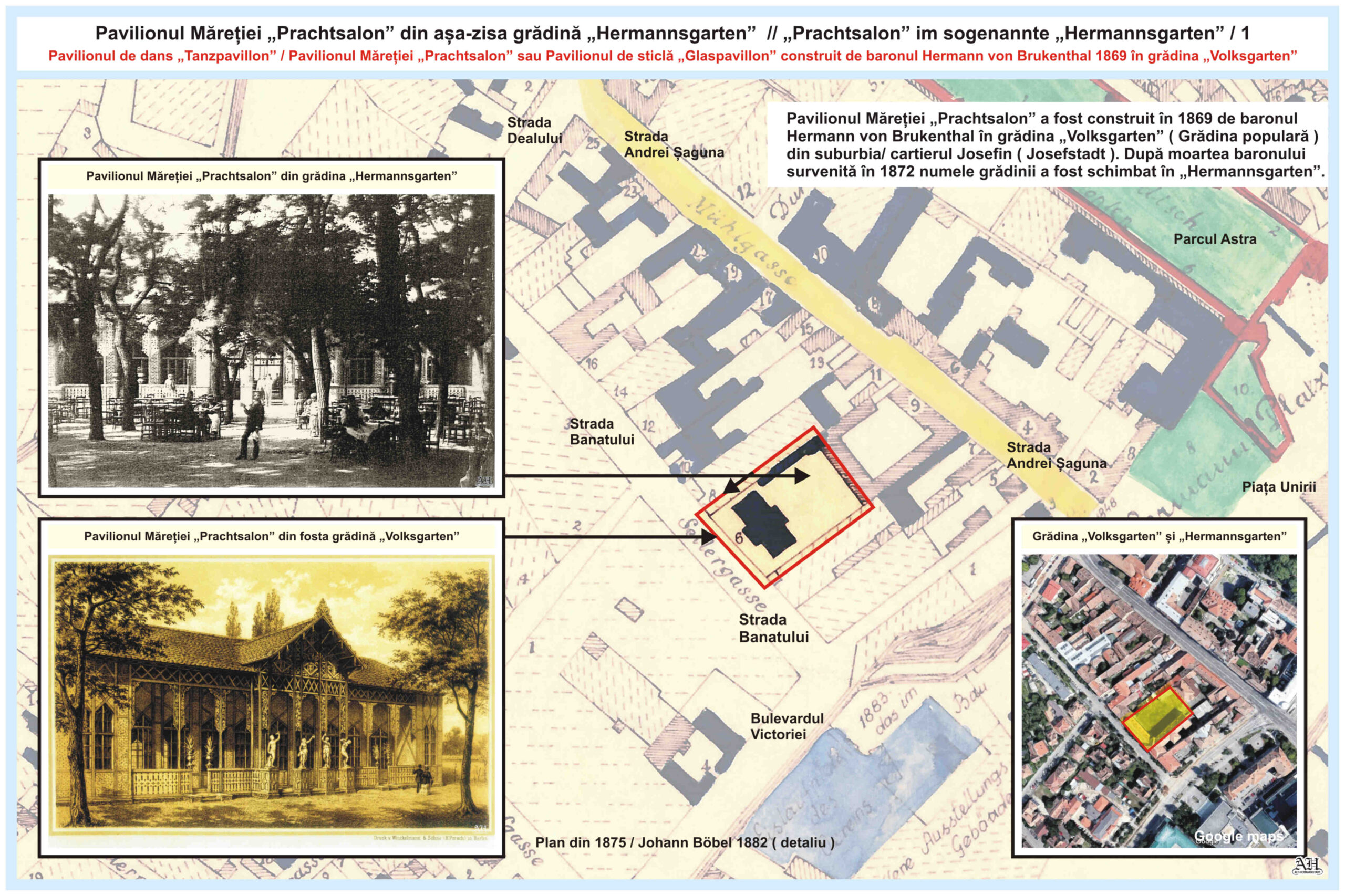 În această grădină, care se îndindea între str. Andrei Șaguna nr.5 ( vechea adresă: Mühlgasse Nr.9 ) și str. Banatului nr.2 ( vechea adresă: Seilergasse Nr.6 ), exista deja la mijlocul secolului al XIX-lea pavilionul de vară „Sommer-Salon”, care aparținea hanului „Zur Stadt Wien” // „La orașul Viena” din strada A. Șaguna nr.5, al cărui proprietar era Johann Wanke. În 1855, pavilion de vară a fost distrus de un incendiu, care a afectat și o parte din casa lui Andreas Böbel de la numărul 7a.