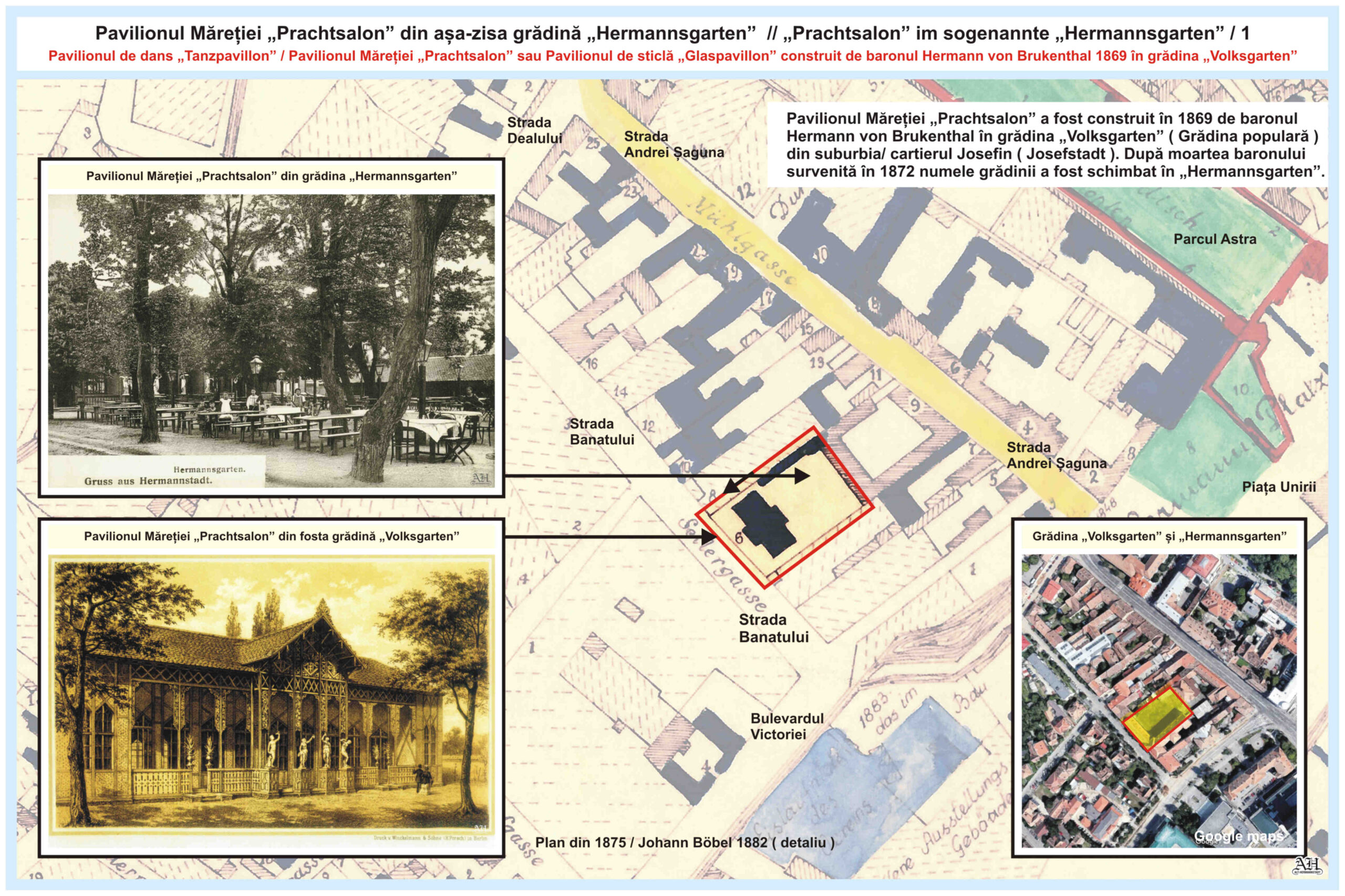 În această grădină, care se îndindea între str. Andrei Șaguna nr.5 ( vechea adresă: Mühlgasse Nr.9 ) și str. Banatului nr.2 ( vechea adresă: Seilergasse Nr.6 ), exista deja la mijlocul secolului al XIX-lea pavilionul de vară „Sommer-Salon”, care aparținea hanului „Zur Stadt Wien” // „La orașul Viena” din strada A. Șaguna nr.5, al cărui proprietar era Johann Wanke. În 1855, pavilion de vară a fost distrus de un incendiu, care a afectat și o parte din casa lui Andreas Böbel de la numărul 7a.
