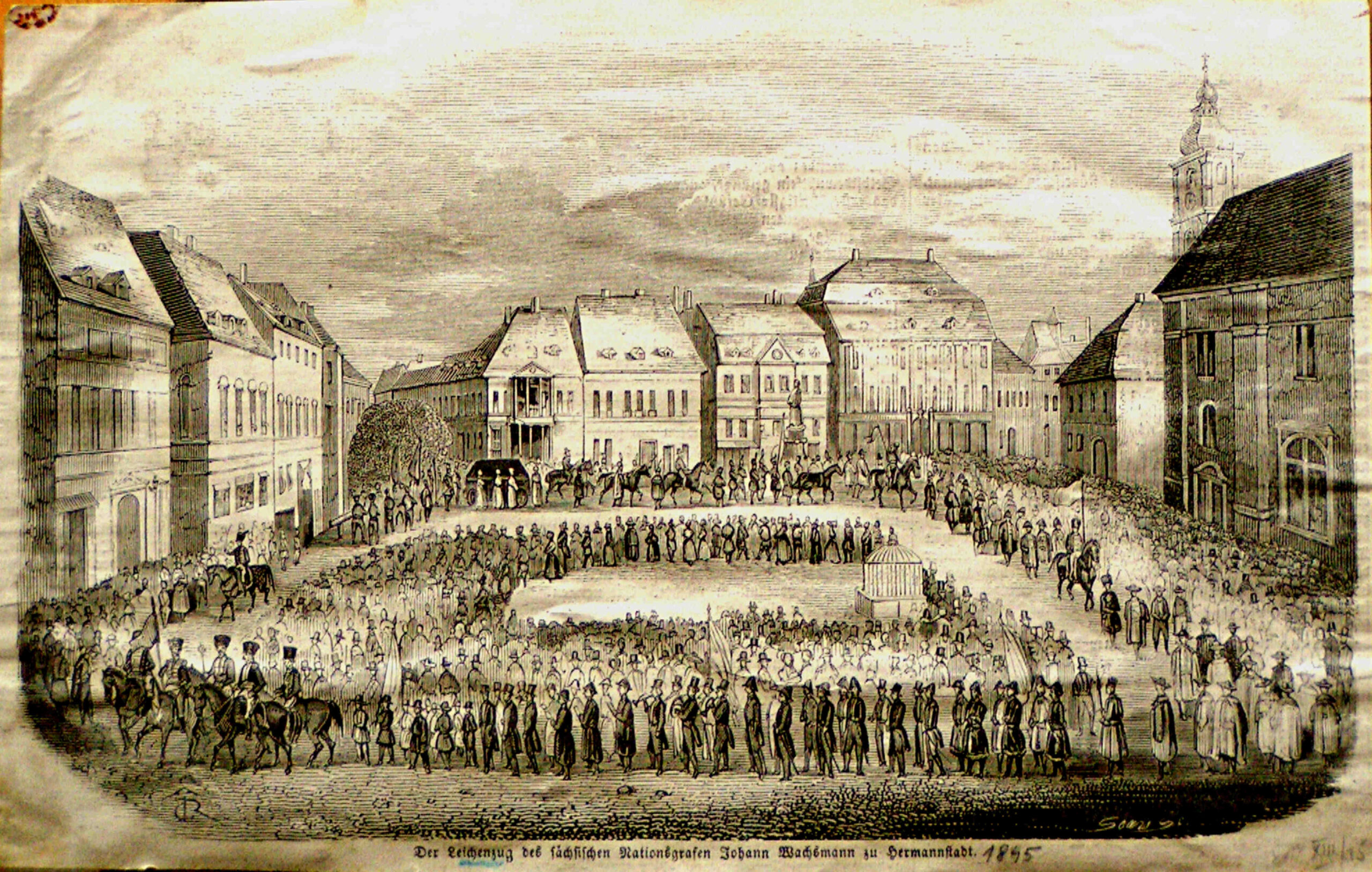 În 1845, ziarul Illustrierte Zeitung din Leipzig, publicase o ilustrație în care apare Piața Mare din Sibiu. Xilogravura intitulată „Der Leichenzug des sächsischen Nationsgrafen Johann Wachsmann“, bazată pe un desen al fotografului sibian Theodor Glatz, înfățișa cortegiul funeral al comitelui sas, judele regal Johann Wachsmann, născut la Medias la 29 noiembrie 1774 și decedat la Sibiu la 7 mai 1845.