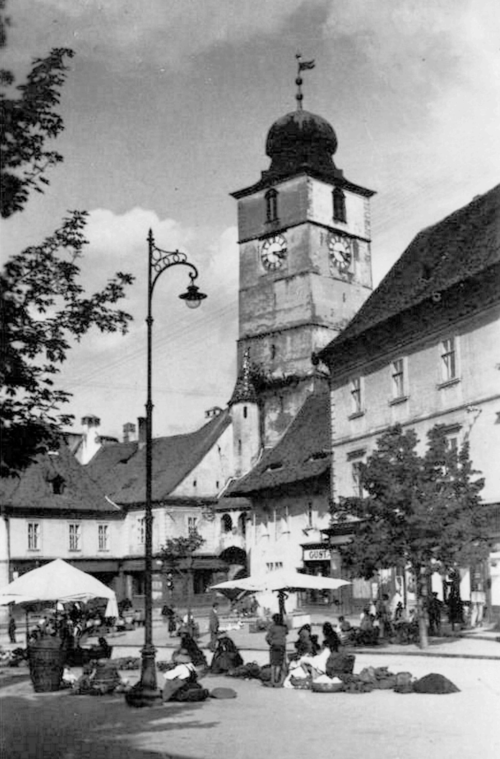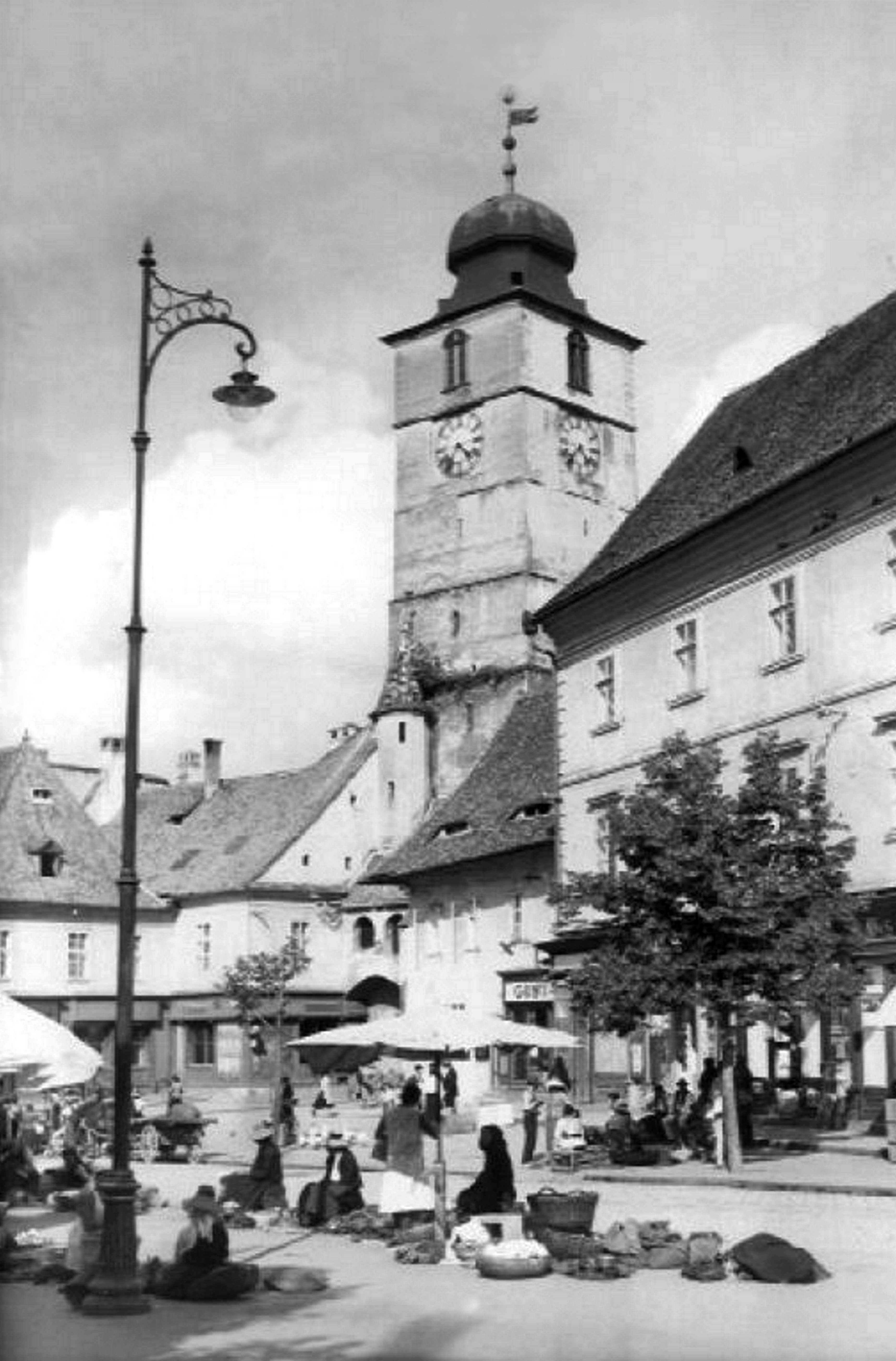 Aceste două fotografii au fost făcute de renumitul fotograf sibian Emil Fischer în anii 1930 ( probabil 1934 ). Emil Fischer obișnuia sa fotografieze același motiv stradal de două ori într-o perioadă scurtă de timp, o practica des folosită de fotografi în secolul 19 și începutul secolului 20. Intervalul de timp scurs între cele două expuneri a fost folosit de fotograf pentru a schimba plăcuța fotografică negativă ( clișeul de sticlă ) din apatarul de fotografiat montat pe un trepied din lemn. Și aceste două instantanee au fost realizate la un interval de 20 de minute, cum ne destăinuie ceasul de pe Turnul Sfatului! Prima a fost făcută la ora 15 și 16 minute iar a doua la ora 15 și 36 de minute. Fotografii din arhiva grupului de Facebook Alt-Hermannstadt.