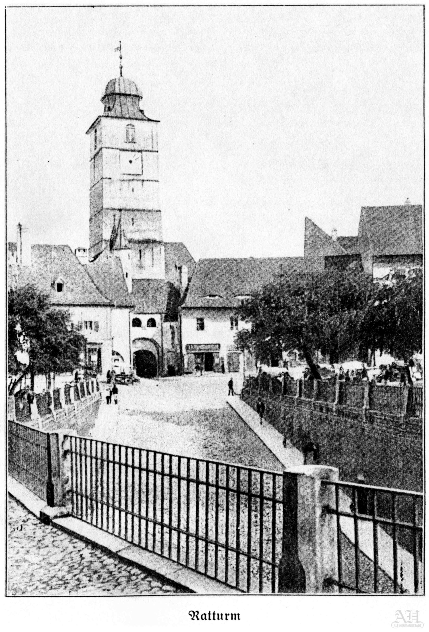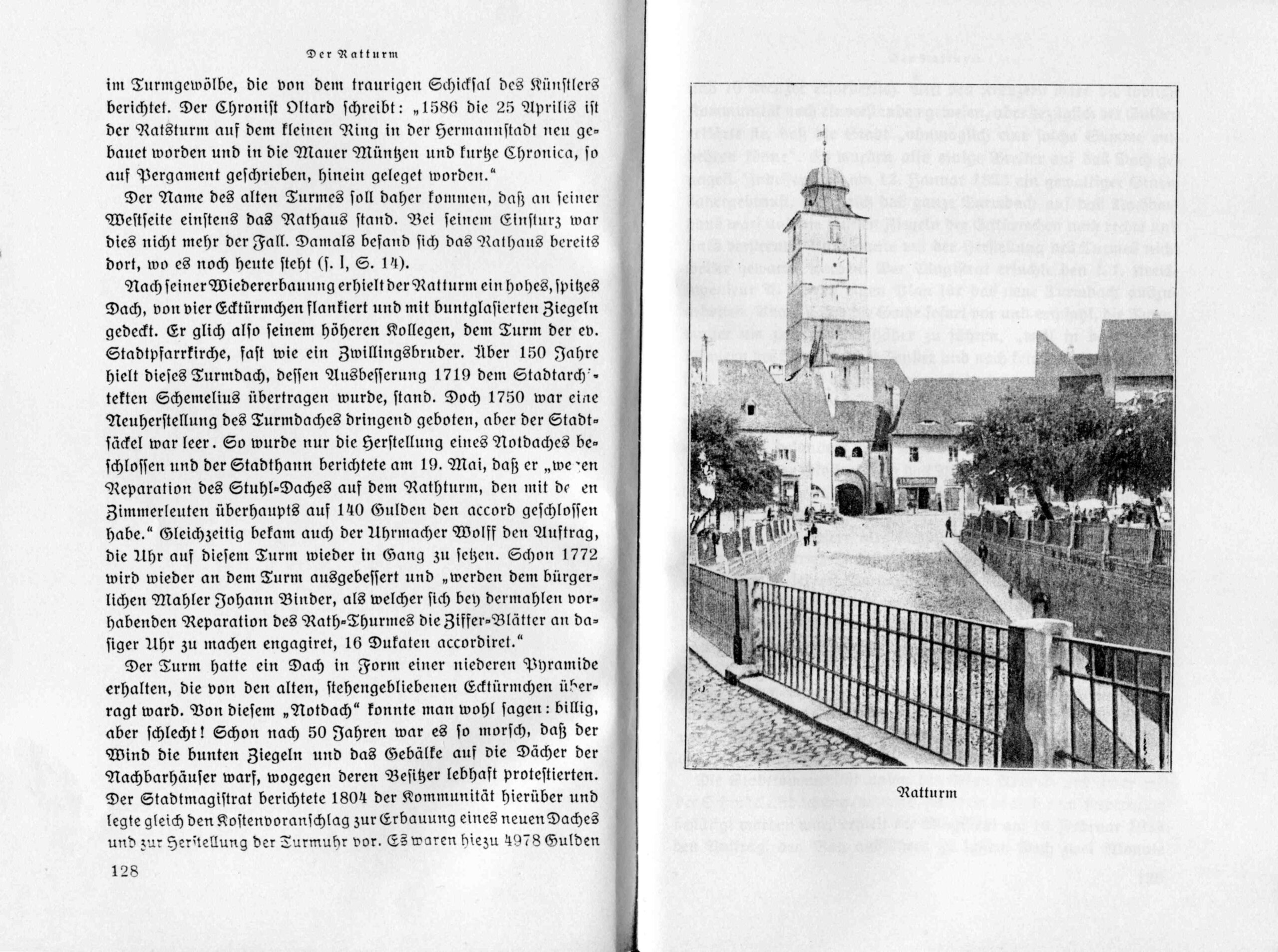 „Kein anderes Gebäude Hermannstadts ist so oft gezeichnet, gemalt und photographiert worden, wie der Ratturm! Er verdankt diesen Vorzug dem trotzigen Blechhelm, der sein altes Gemäuer niederdrückt. Dieses Turmdach weicht so sehr von den in unseren sächsischen Städten üblichen Formen ab, daß es eben dadurch auffällt. Es macht den Turm zum Wahrzeichen der Stadt. Er ist kennzeichnend für das Stadtbild. Nicht immer war dies so, denn der alte Turm trug durch Jahrhunderte ein hohes, mit buntglasierten Ziegeln gedecktes Pyramidendach, jenem des Turmes der ev. Stadtpfarrkirche ähnlich.