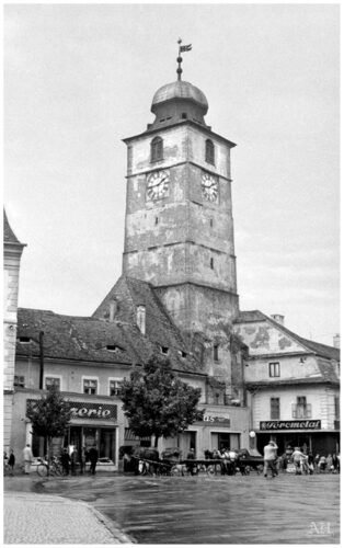 Dreapta: Turnul Sfatului din Sibiu fotografiat la începutul anilor 1960 din Piața Mare, Sibiu.