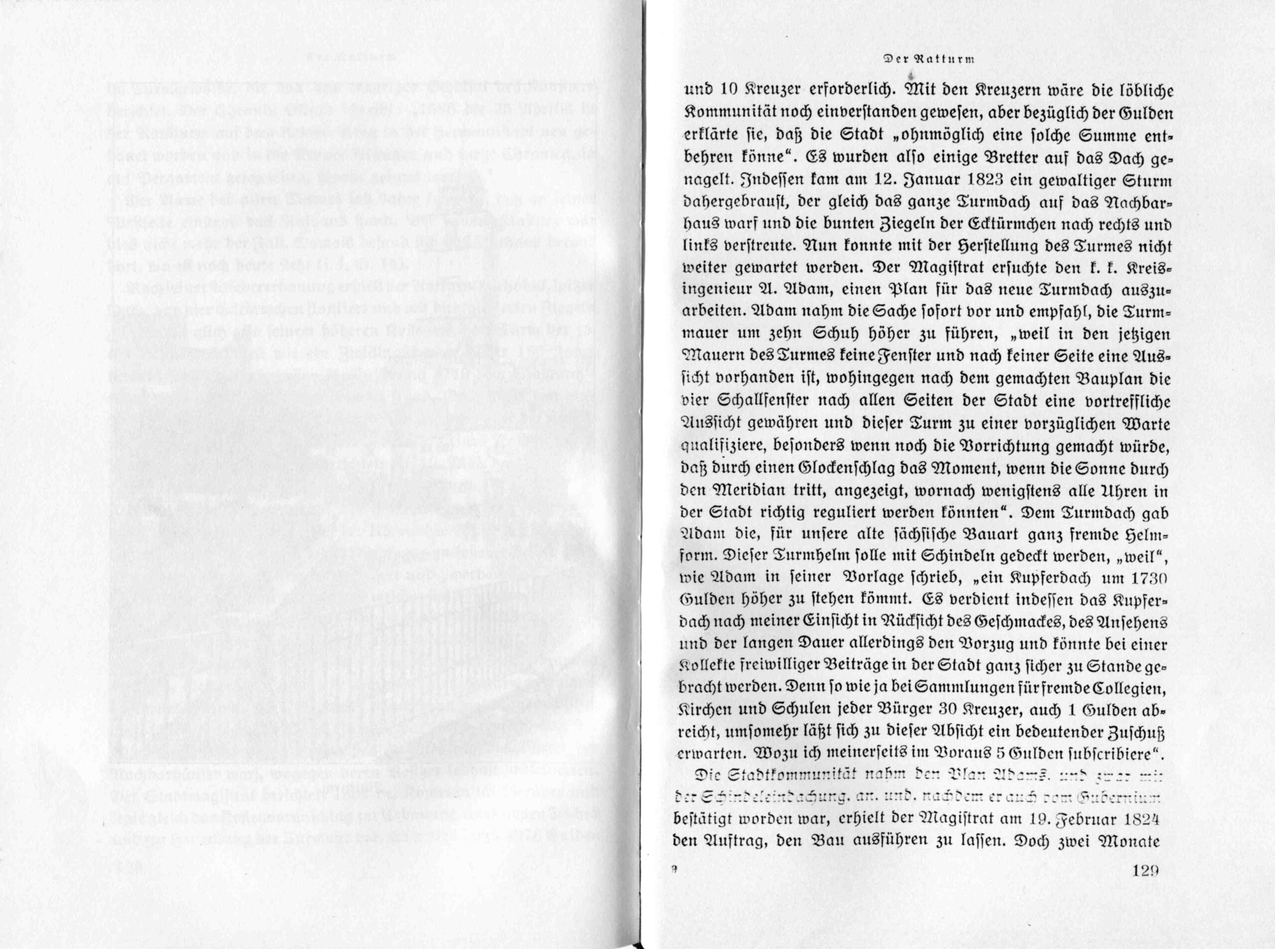 Der Stadtmagistrat berichtete 1804 der Kommunität hierüber und legte gleich den Kostenvoranschlag zur Erbauung eines neuen Daches und zur Herstellung der Turmuhr vor. Es waren hiezu 4978 Gulden und 10 Kreuzer erforderlich. Mit den Kreuzern wäre die löbliche Kommunität noch einverstanden gewesen, aber bezüglich der Gulden erklärte sie, daß die Stadt „ohnmöglich eine solche Summe entbehren könne”. Es wurden also einige Bretter auf das Dach genagelt. Indessen kam am 12. Januar 1823 ein gewaltiger Sturm dahergebraust, der gleich daß ganze Turmdach auf das Nachbarhaus warf und die bunten Ziegeln der Ecktürmchen nach rechts und links verstreute. Nun konnte mit der Herstellung des Turmes nicht weiter gewartet werden. Der Magistrat ersuchte den k. k. Kreisingenieur A. Adam, einen Plan für daß neue Turmdach auszuarbeiten. Adam nahm die Sache sofort vor und empfahl, Die Turmmauer um zehn Schuh höher zu führen, „weil in den jetzigen Mauern des Turmes keine Fenster und nach keiner Seite eine Aussicht vorhanden ist, wohingegen nach dem gemachten Bauplan die vier Schallfenster nach allen Seiten der Stadt eine vortreffliche Aussicht gewähren und dieser Turm zu einer vorzüglichen Warte qualifiziere, besonders wenn noch die Vorrichtung gemacht würde, daß durch einen Glockenschlag das Moment, wenn die Sonne durch den Meridian tritt, angezeigt, wornach wenigstens alle Uhren in der Stadt richtig reguliert werden könnten”. Dem Turmdach gab Adam die, für unsere alte sächsische Bauart ganz fremde Helmform. Dieser Turmhelm solle mit Schindeln gedeckt werden, „weil”, wie Adam in feiner Vorlage schrieb, „ein Kupferdach um 1730 Gulden höher zu stehen kömmt. Es verdient indessen das Kupferdach nach meiner Einsicht in Rücksicht des Geschmackes, des Ansehens