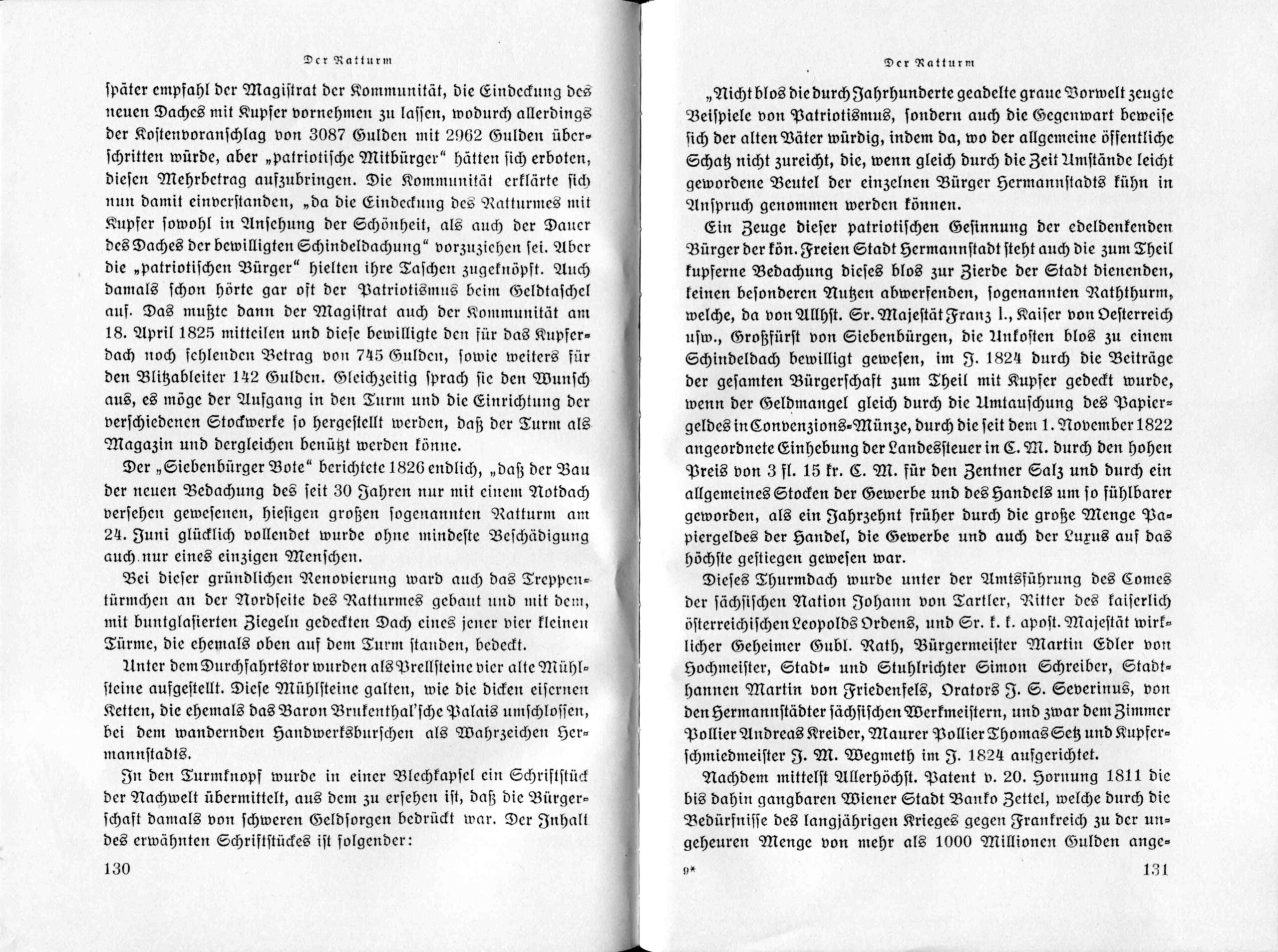 Ein Zeuge dieser patriotischen Gesinnung der edeldenkenden Bürger der kön. Freien Stadt Hermannstadt steht auch die zum Theil kupferne Bedachung dieses bIos zur Zierde der Stadt dienenden, keinen besonderen Nutzen abwerfenden, sogenannten Raththurm, welche, da von Allhst. Sr. Majestät Franz I., Kaiser von Oesterreich usw., Großfürst von Siebenbürgen, die Unkosten blos zu einem Schindeldach bewilligt gewesen, im J. 1824 durch Die Beiträge der gesamten Bürgerschaft zum Theil mit Kupfer gedeckt wurde, wenn der Geldmangel gleich durch die Umtauschung des Papiergeldes in Convenzions-Münze, durch die seit dem 1. November 1822