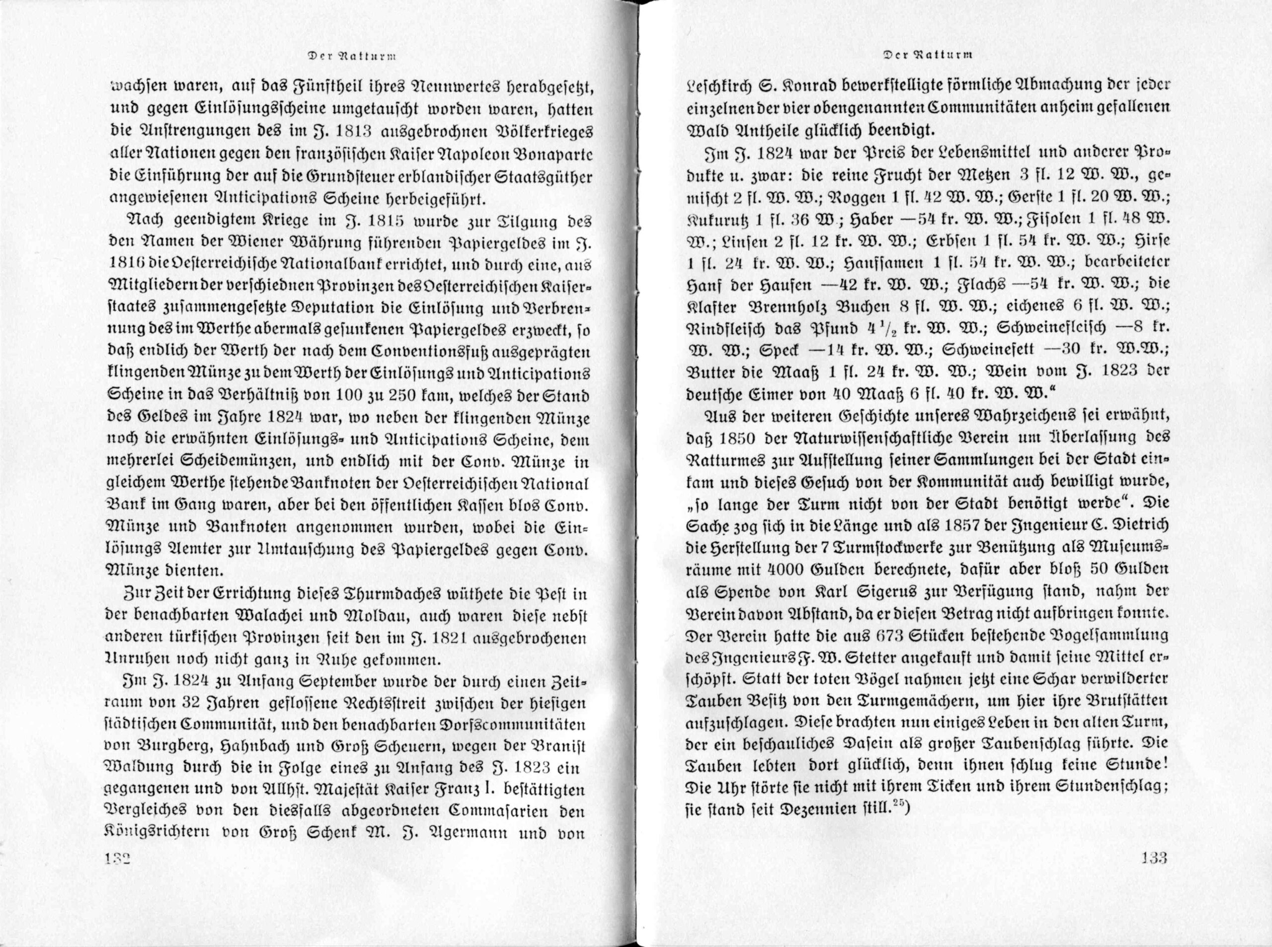 Aus der weiteren Geschichte unseres Wahrzeichens sei erwähnt, daß 1850 der Naturwissenschaftliche Verein um Überlassung des Ratturmes zur Ausstellung seiner Sammlungen bei der Stadt einkam und dieses Gesuch von der Kommunität auch bewilligt wurde, „so lange der Turm nicht von der Stadt benötigt werde”. Die Sache zog sich in die Länge und als 1857 der Ingenieur E. Dietrich die Herstellung der 7 Turmstockwerke zur Benützung als Museumsräume mit 4000 Gulden berechnete, dafür aber bloß 50 Gulden als Spende von Karl Sigerus zur Verfügung stand, nahm der Verein davon Abstand, da er diesen Betrag nicht aufbringen konnte.