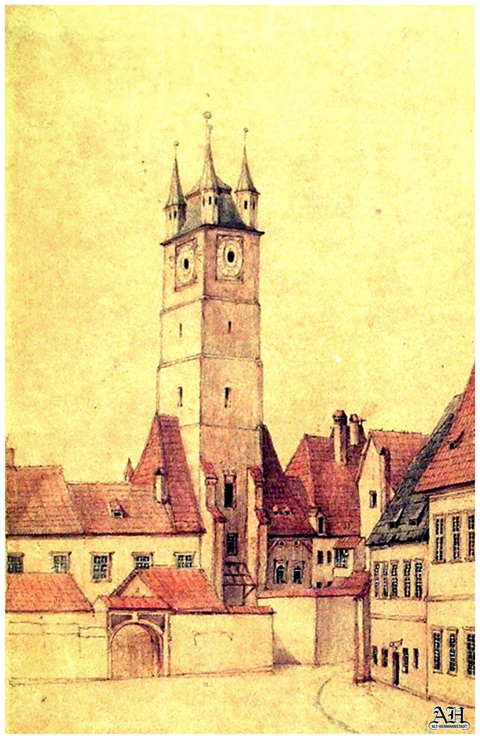 Stânga: Turnul Sfatului din Sibiu la sfârșitul sec al XVIII-lea. Acest detaliu dintr-o deosebit de frumoasă acuarelă, atribuită unui artist necunoscut, redă un fragment din renumita pictură realizată de artistul sibian Franz Neuhauser cel Tânăr ( 1763-1836 ) în anul 1789 intitulată: Vue de la foire à Hermannstadt – Der Hermannstädter Jahrmarkt, nach der Natur gemalt 1789 // Vue de la foire à Hermannstadt – Iarmaroc la Sibiu, pictat după natură 1789. Turnul Sfatului apare cu acoperișul piramidal și cele patru turnulețe în colțuri. O parte din țiglele colorate, salvate 1824 cu ocazia demolării celor patru turnulețe de pe acoperiș, au fost folosite pentru acoperișul turnulețului octogonal cu scară melc (aflat pe partea spre Piața Mică), turnuleț care face legătura între nivelul II și III.chs & Sohn” din Bernburg.