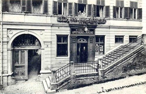 La parterul clădirii construită de farmacistul Karl (Carl) Jikeli în 1881 a funcționat din 1882 până la naționalizare în 1949 farmacia Zur Krone // La Coroana, aflată anterior în clădirea fostului han Zur ungarischen Krone // La Coroana Ungurească de la nr. 1.