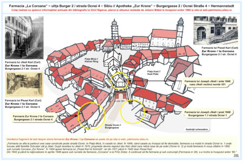 „Die Apotheke ZUR KRONE ~ Hermannstadt, Burgergasse 2 / Ocnei Straße 4” // „Farmacia LA COROANA ~ Sibiu, ulița Burger 2 / strada Ocnei 4”