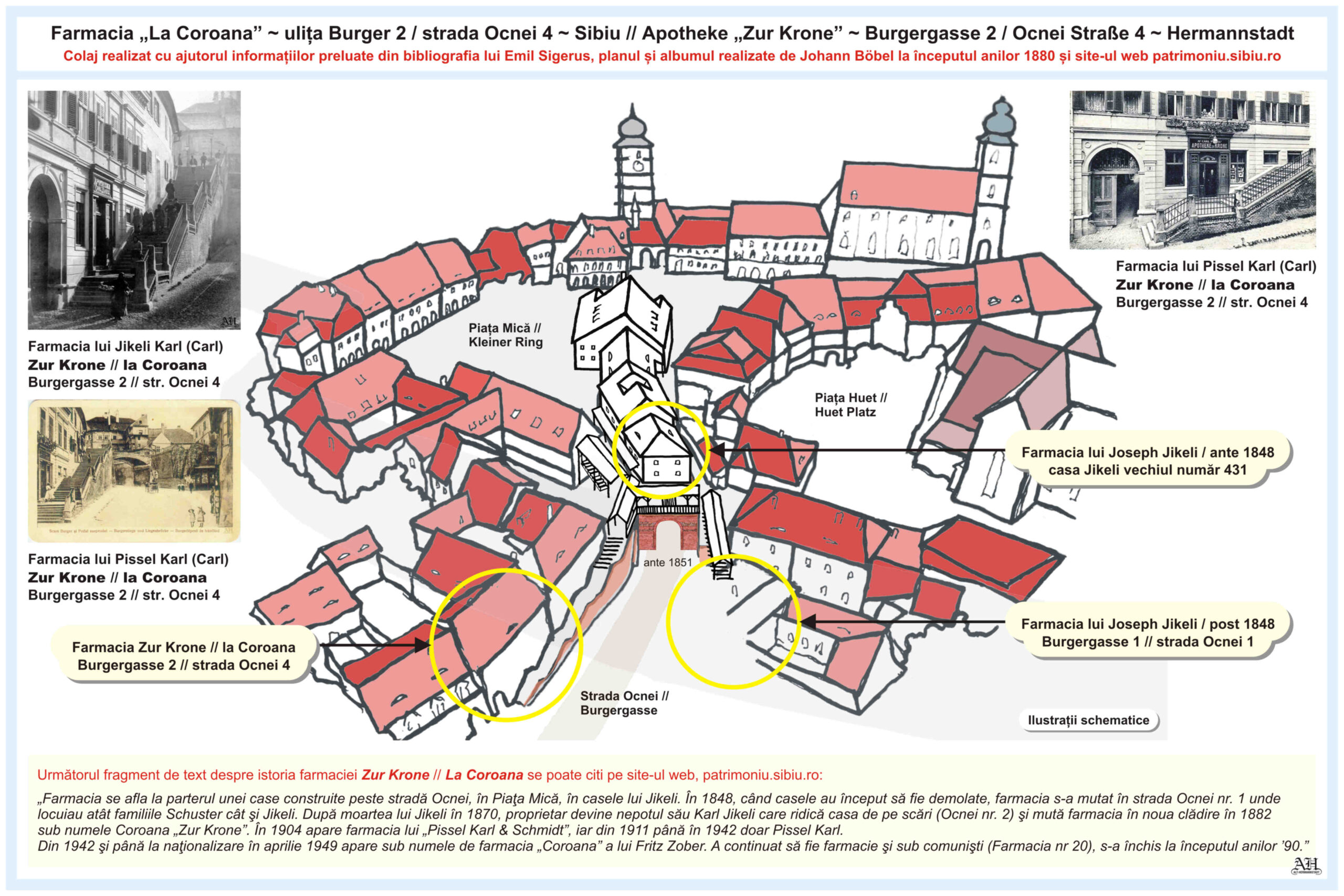 Din cartea de adrese editată 1904 aflăm că farmacia lui Jikeli a fost preluată de Karl Pissel și Schmidt: Pissel & Schmidt, Apotheker, zur Krone, Burgergasse 2. Cartea de adrese din 1911 ne informează că farmacia La Coroana se afla în proprietatea lui Karl Pissel: Pissel Karl, Mr. (Zur Krone). Burgergasse 2.