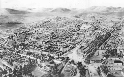Dreapta: „Panorama orașului Sibiu”, este cea mai cunoscută pictură realizată de August Sporner. Pictura datată 1883 prezintă o privire de ansanblu foarte detaliată asupra orașului Sibiu, văzut de la înălțime, bird’s eye view / Vogelperspektive.
