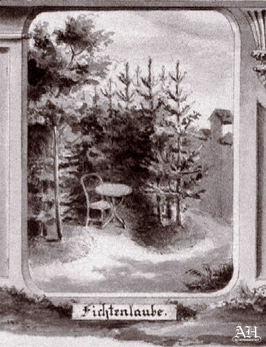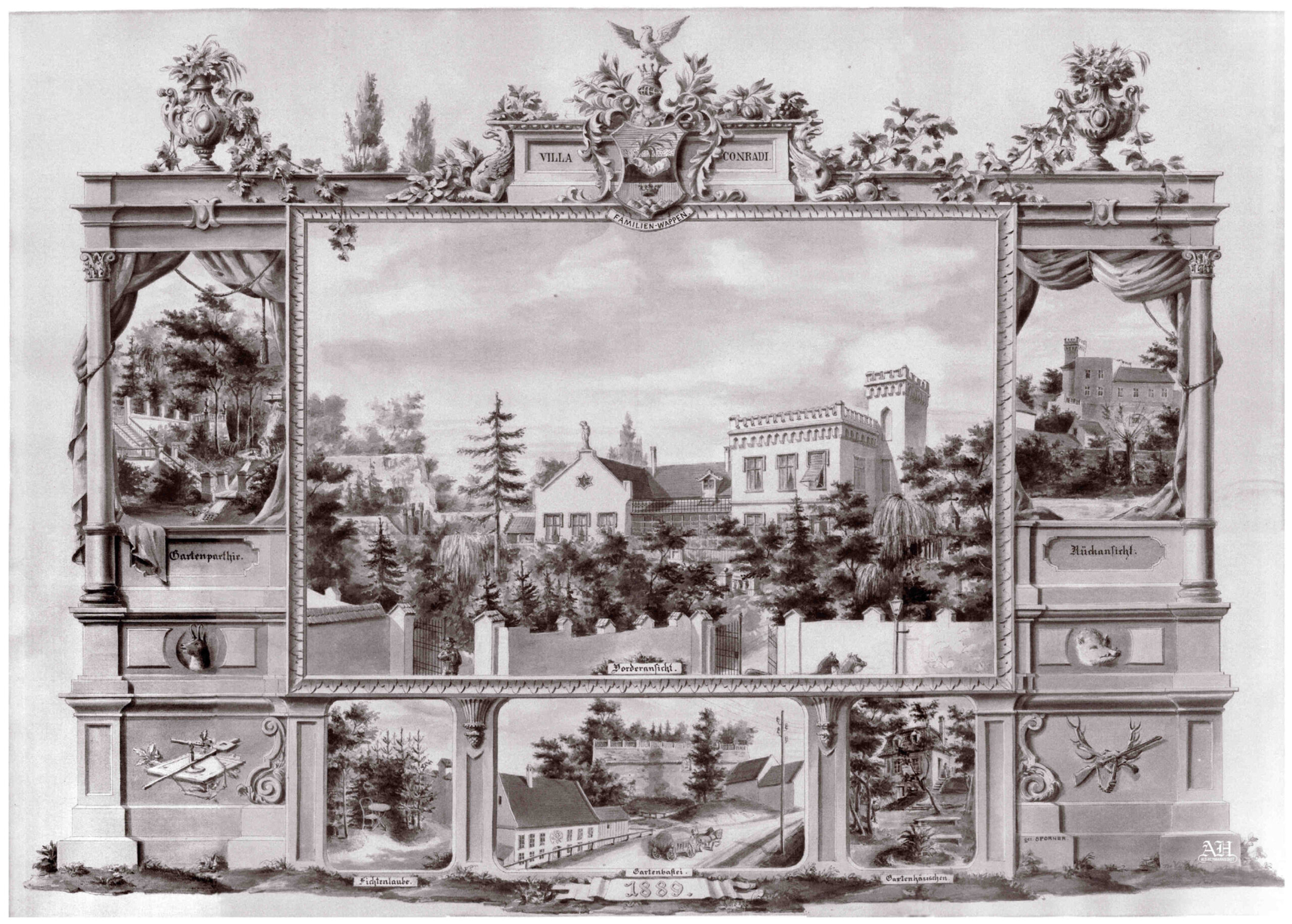 În această litografie, compusă din șase casete cu diferite vederi / detalii ale grădinii și clădirii Conradi, apare și blazonul familiei Conrad!