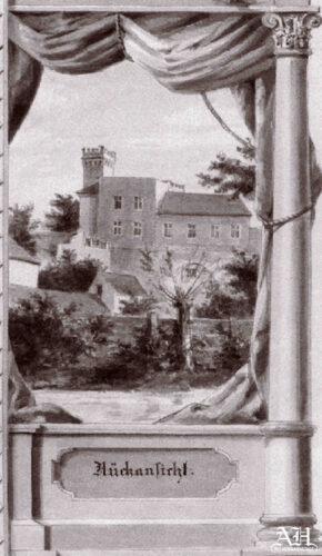 Sporner pictează o vedere din față, „Vorderansicht”, în care apare fereastra hexagonală, Steaua lui David, pe frontispiciul corpului sud-vestic, sub statuia femeii cu mâna dreaptă făcută streașină la ochi pe coama acoperișului, turnul cu creneluri și alte detalii interesante ; o vedere din spate, „Rückansicht”, foarte intereant detaliu ; un pasaj din grădină, „Gartenparthie”, cu fântâna arteziană și cascada mică din șanțul prin care curgea pârâul ; un foișor de molid, „Fichtenlaube”, situat lângă zidul grădinii ; o căsuță de grădină, „Gartenhäuschen”, care există și astăzi lângă intrarea în bastion și un detaliu cu latura sud-vestică a bastionul Șoldiș, „Gartenbastei”, în care apare pasajul pietonal spre str. Dârstelor, cu podețul peste pârâul care alimenta cu apă moara orășenească lângă Șoldiș – zona Azilul de copii / adresa veche str. A. Șaguna 18 și moara orășenească cu sită sub Șoldiș / adresa veche str. A. Șaguna 20, demolată 2008.
