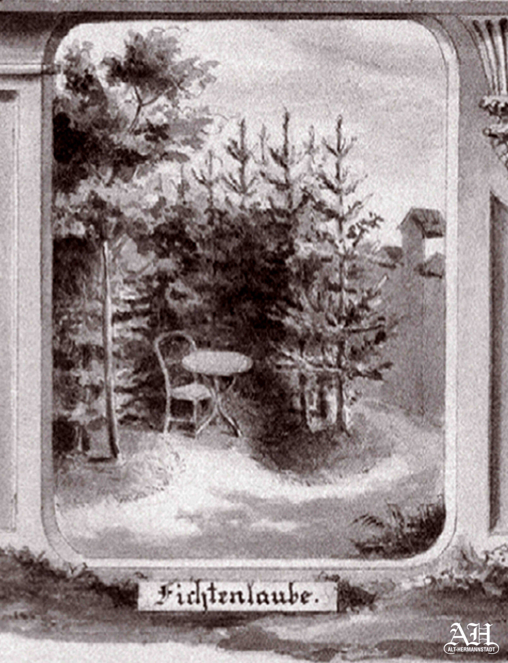 Stânga: „Grădina cu ruine artificiale”, arată grădina englezească cu terase, cascadă, fântână arteziană și oranjerie amenajată de baronul Michael Brukenthal în 1785 pe bastionul Șoldiș. Pictura a fost realizată de August Sporner în 1875, după ce parcela cu grădină ajunse în posesia lui Gustav Adolph Conrad în 1869.
