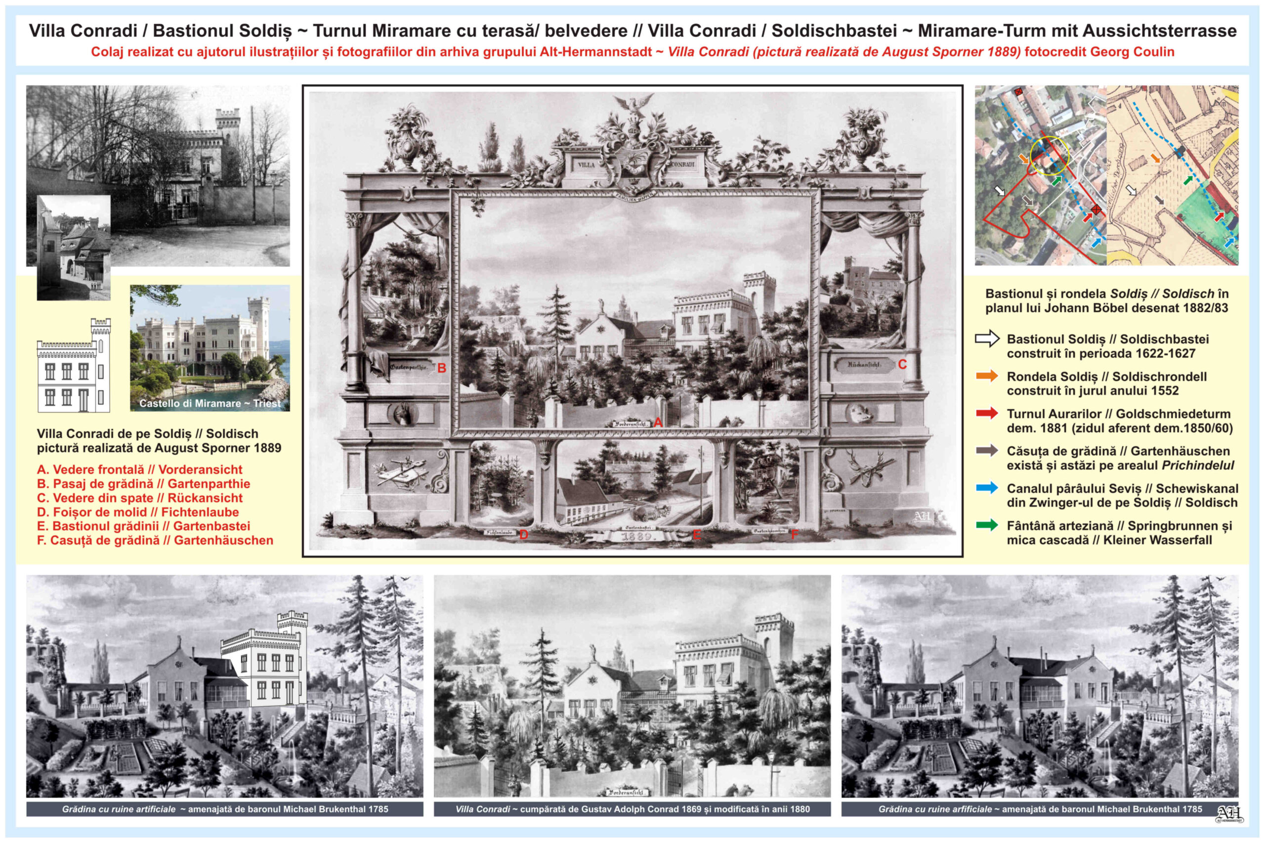 Pictura intitulată „Villa Conradi” a fost realizată de artistul sibian August Sporner în 1889. Tabloul arată grădină și vila CONRADI, situată în zona rondelei de pe bastionul Soldiș // Soldischbastei din Sibiu, după ce proprietarul Gustav Adolph Conrad a ridicat turnul cu creneluri și a supraetajat corpul nord-estic a clădirii cu o terasă/ belvedere în perioada anilor 1883-1889.