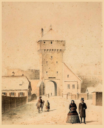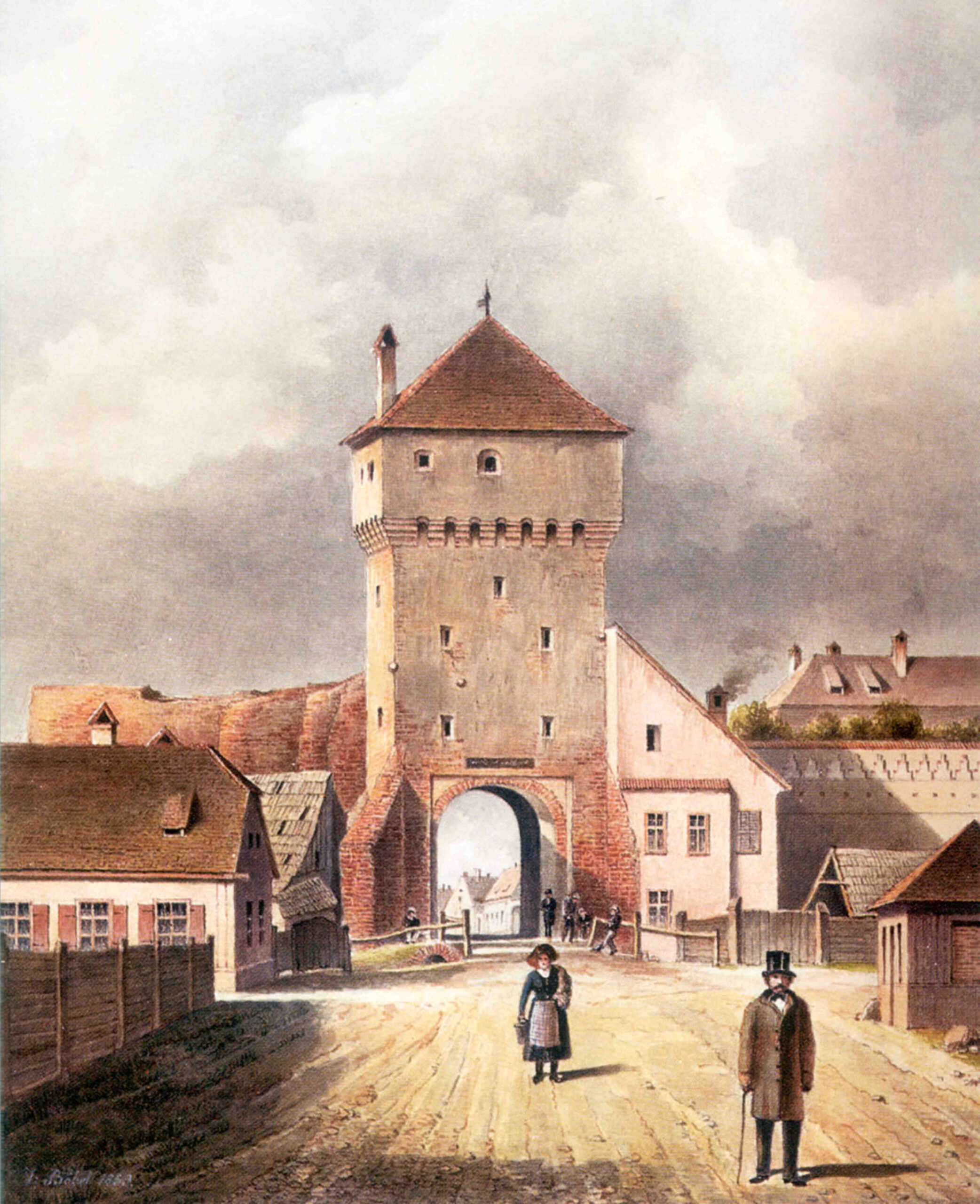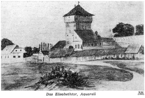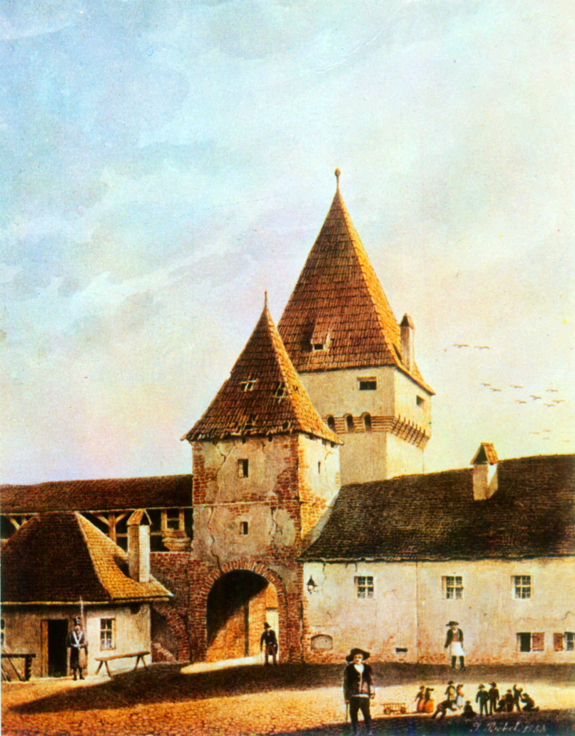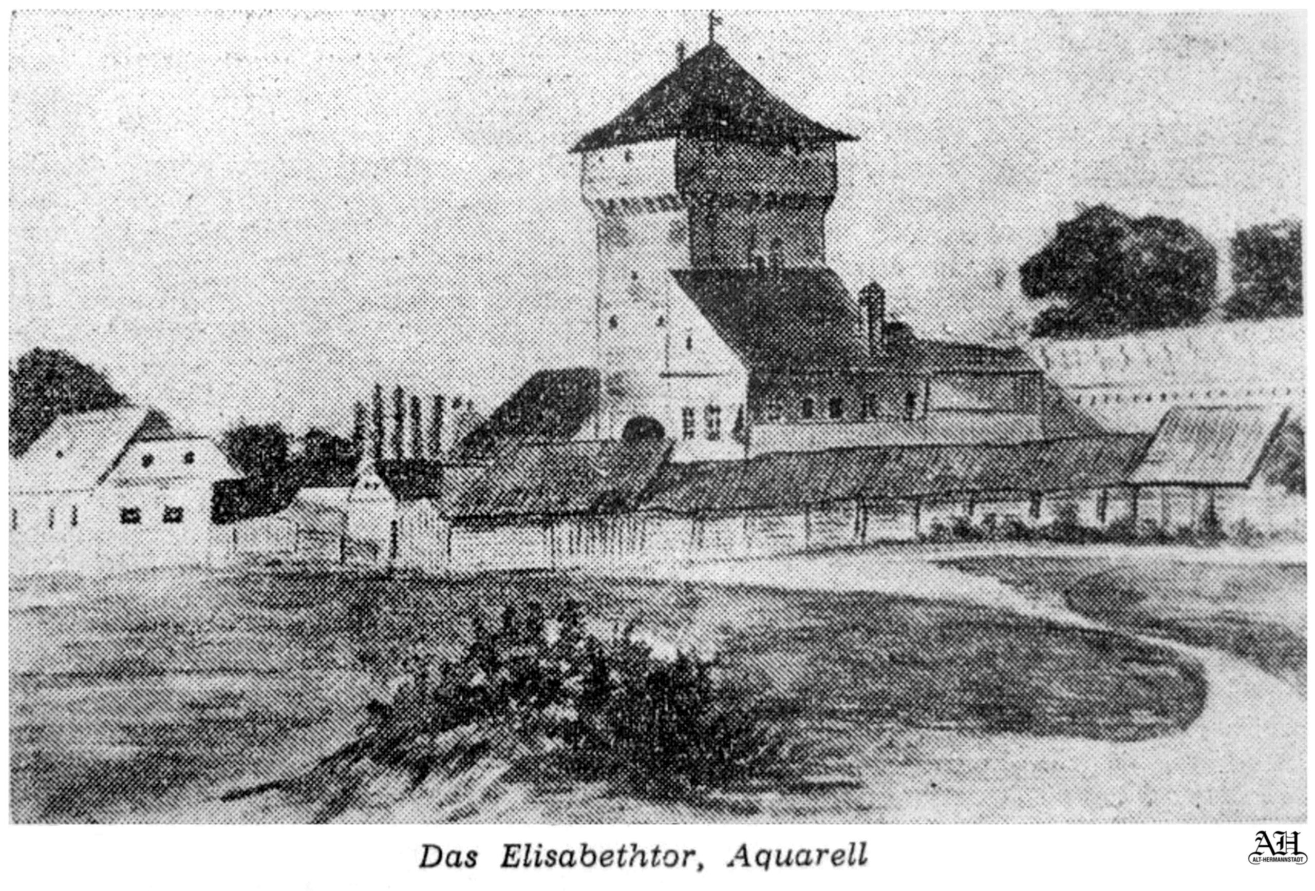 Turnul exterior de la Poarta Elisabeta pictat de Johann Böbel în 1859. Turnul exterior a fost demolat în 1865.