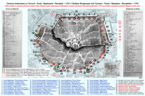 În planul orașului Sibiu întocmit cu această ocazie au fost notate denumirile construcțiilor de fortificație ale centurii exterioare: turnuri, porți, bastioane, dar și edificii sacrale, biserici și străzi existente în Sibiu 1751.