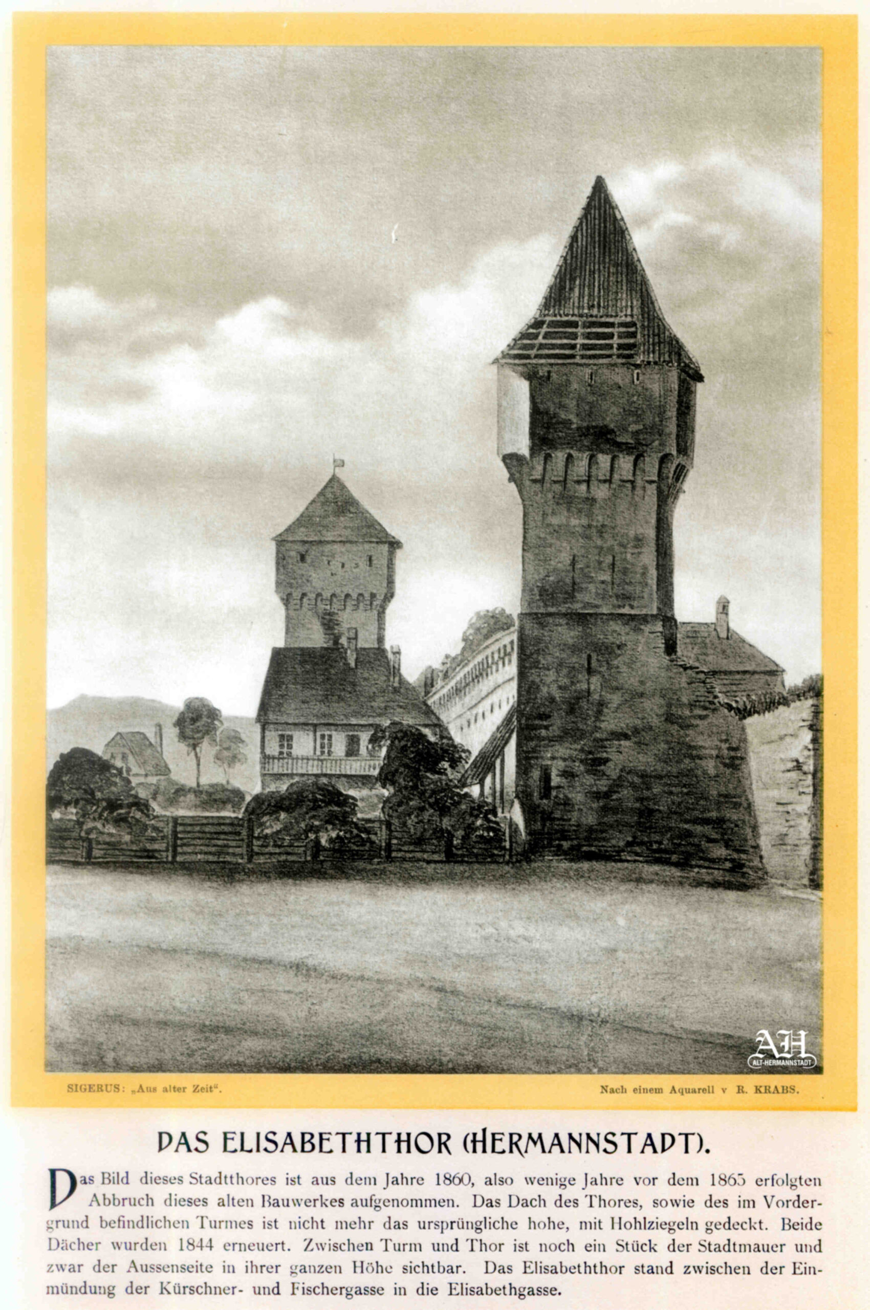 Dreapta: Ilustrația intitulată, „Das Elisabeththor (Hermannstadt)” // „Poarta Elisabetha (Sibiu)”, a fost realizată după o acuarelă de Friedrich August Robert Krabs, executată între 1853 și 1865. În prim plan se vede Turnul Săpunarilor // Seifensieder-Thurm iar în fundal Turnul exterior de la Poarta Elisabetha, demolat 1865.