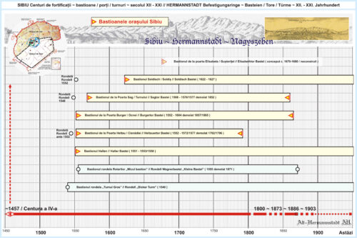 Date cronologice: Primul bastion construit la Sibiu a fost Bastionul Hallen // Haller Bastei ( 1551 – 1553/1558 ), urmat de Bastionul de la Poarta Heltau / Cisnădiei // Heltauertor Bastei ( 1552 – 1572/1577 ), Bastionul de la Poarta Burger / Ocnei // Burgertor Bastei ( 1552 – 1604 ), Bastionul de la Poarta Sag / Turnului // Sagtor Bastei ( 1568 – 1570/1577 ) și Bastionul Soldisch / Soldiș // Soldisch Bastei ( 1622 – 1627 ).